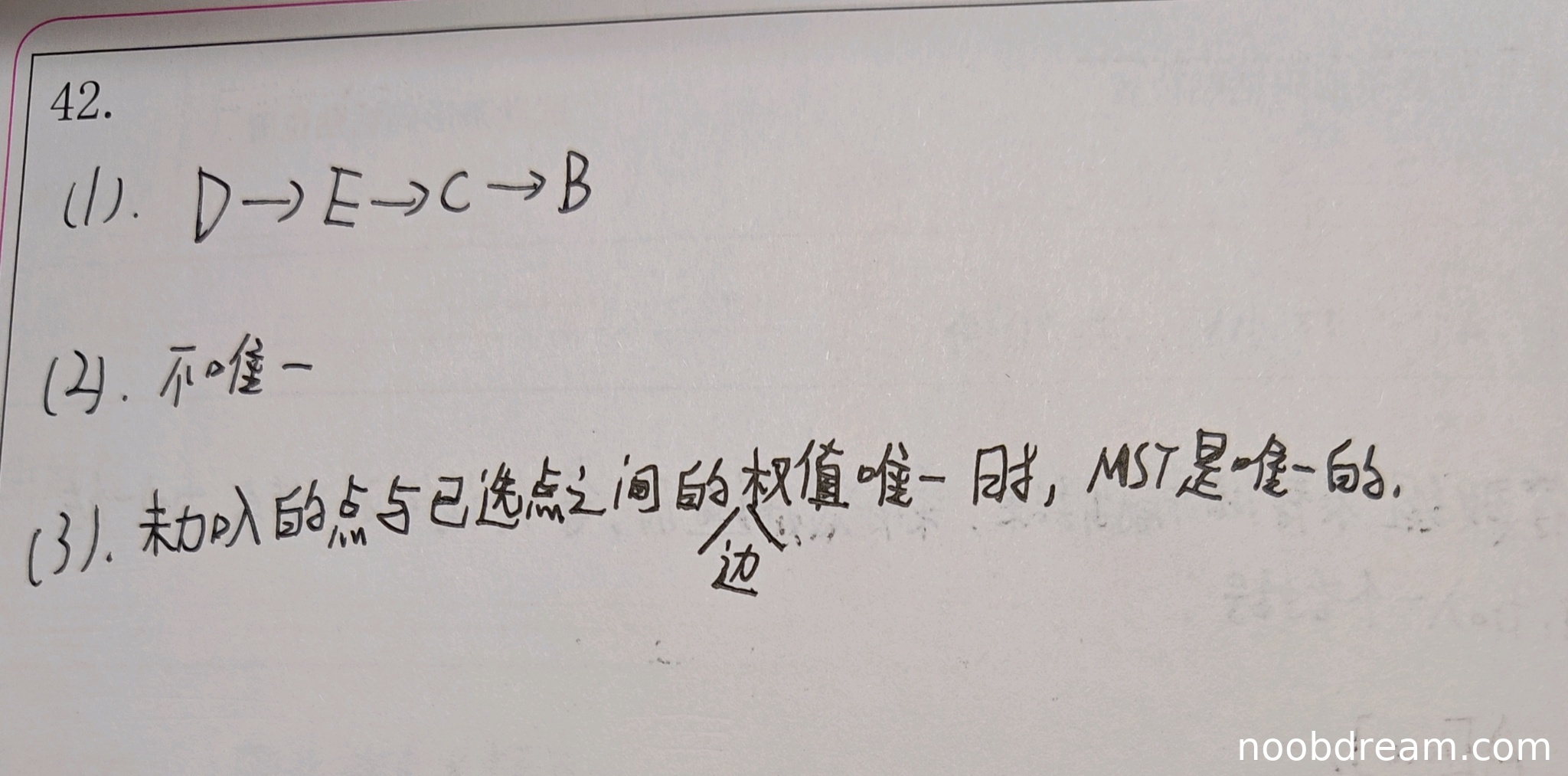 学生回答"未加入的点与已选点之间的权值唯一时",这个描述虽然不精确,但体现了对权值唯一性的认识。标准答案是"任意一个环中所包含的边的权值均不相同",学生的表述可以理解为在Prim算法执行过程中每次选择的边权值唯一,这与MST唯一性的充分条件(所有边权互异)在本质上一致。考虑到表述差异但核心思想正确,给满分2分。