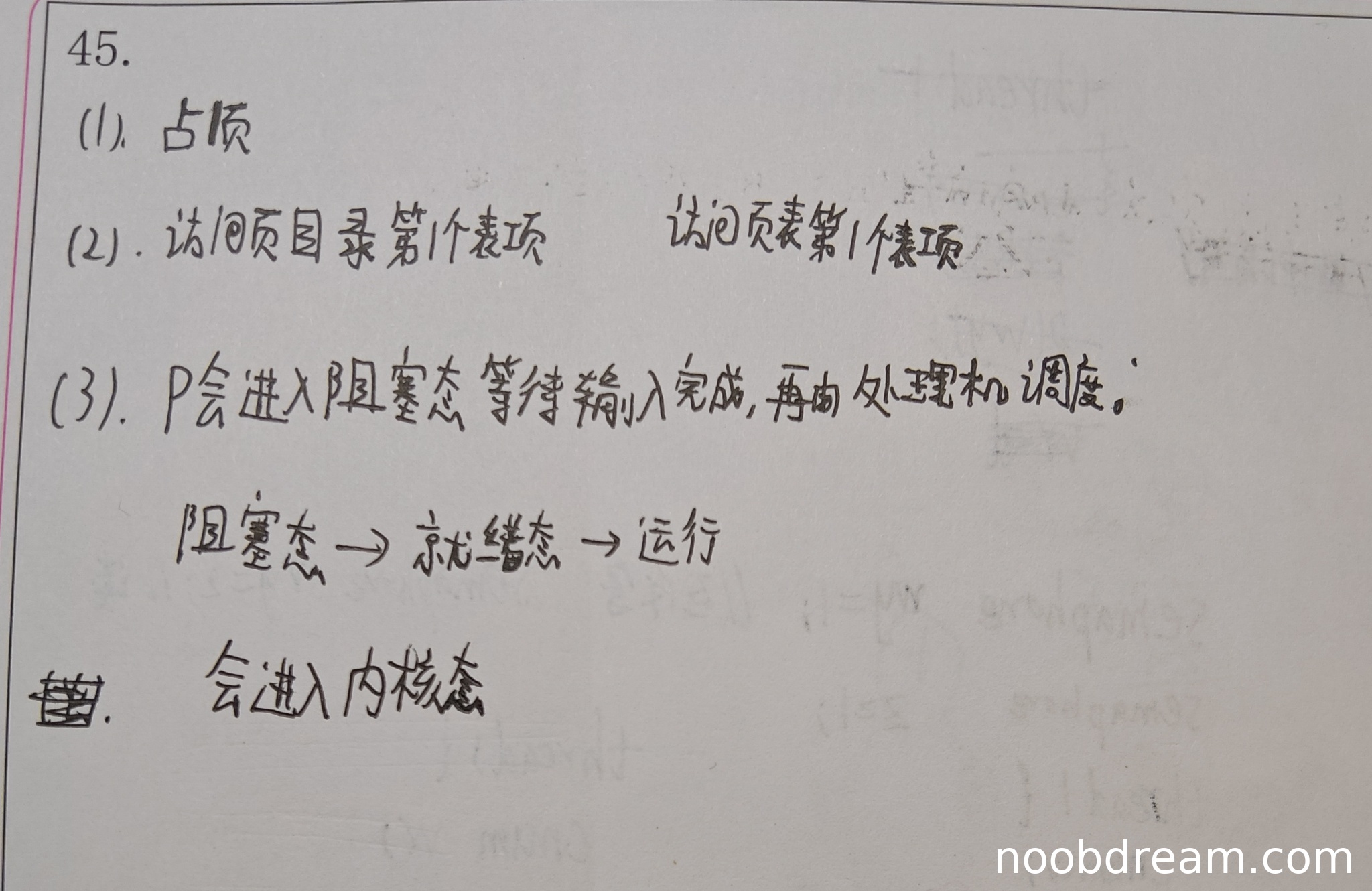 学生回答包含了进程状态变化的完整过程:阻塞态→就绪态→运行态,并明确指出会进入内核态。这与标准答案中进程P因等待输入从执行态变为阻塞态,输入结束被唤醒变为就绪态,被调度后变为运行态,以及CPU从用户态变为内核态的描述完全吻合。得4分。