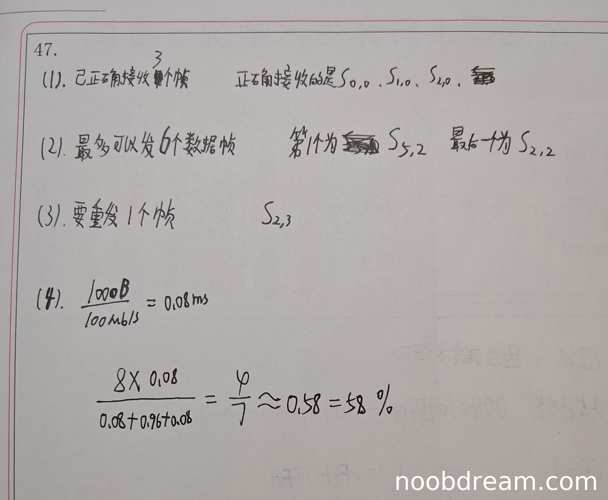 学生的计算过程和方法与标准答案不同,且最终结果58%与标准答案50%不符。信道利用率计算错误,扣1分。得0分。