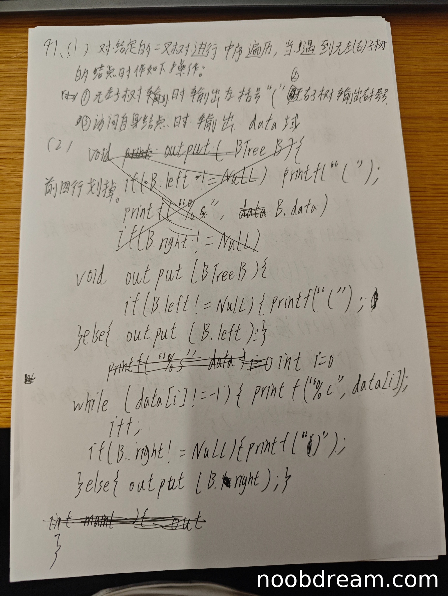 理由:代码框架基本正确(1分),包含了递归遍历的思想(1分)。但是存在严重逻辑错误:括号添加条件错误(扣3分),遍历顺序混乱,先输出data再递归遍历子树(扣2分),存在未定义的data数组和死循环(扣2分)。代码基本不可用,只能给基础分。