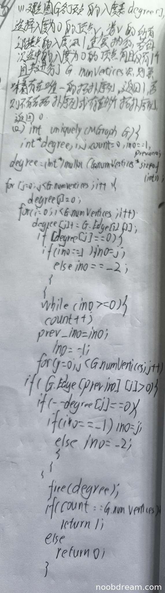 - while循环条件ino>=0,当ino=-2时不会进入循环,但此时可能还有顶点未处理(扣1分)