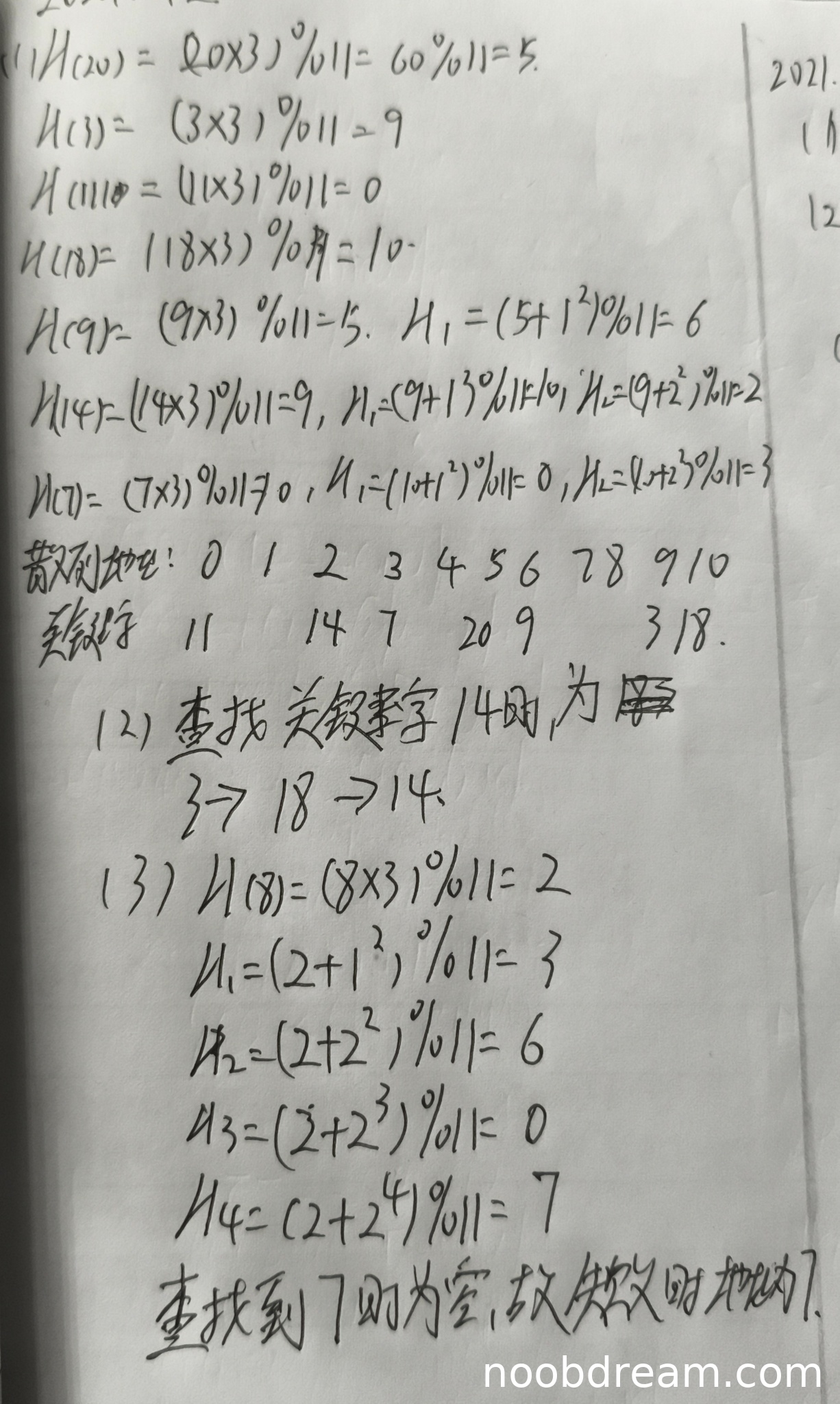 学生正确计算了查找关键字8的探查序列,最终确认查找失败时的散列地址是7。虽然H3的计算公式写成了(2+2^3)%11而不是正确的(2+3^2)%11,但计算结果都是0,不影响最终结果。最终结论正确。
