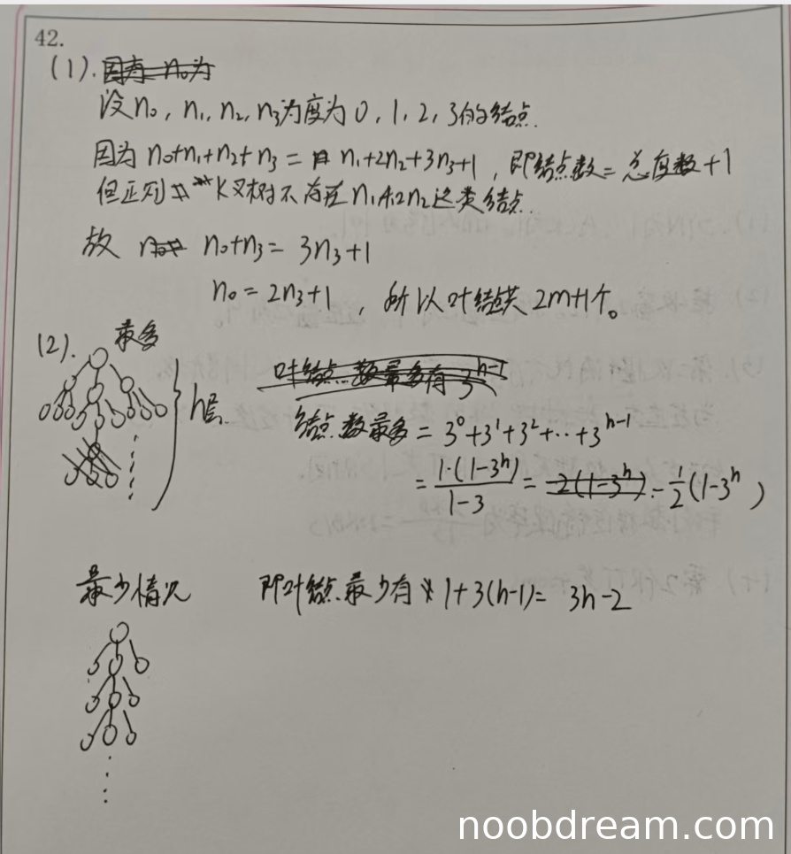学生同样假设k=3进行推导。最多结点数计算正确(等比数列求和),但结果只给出k=3时的表达式;最少结点数推导思路正确(每层除一个分支结点外均为叶结点),但结果也只适用于k=3。由于未给出一般k的表达式,且最多结点数部分得分3分,最少结点数部分得分2分,各扣1分。最多结点数得2分,最少结点数得1分,本小题共得3分。