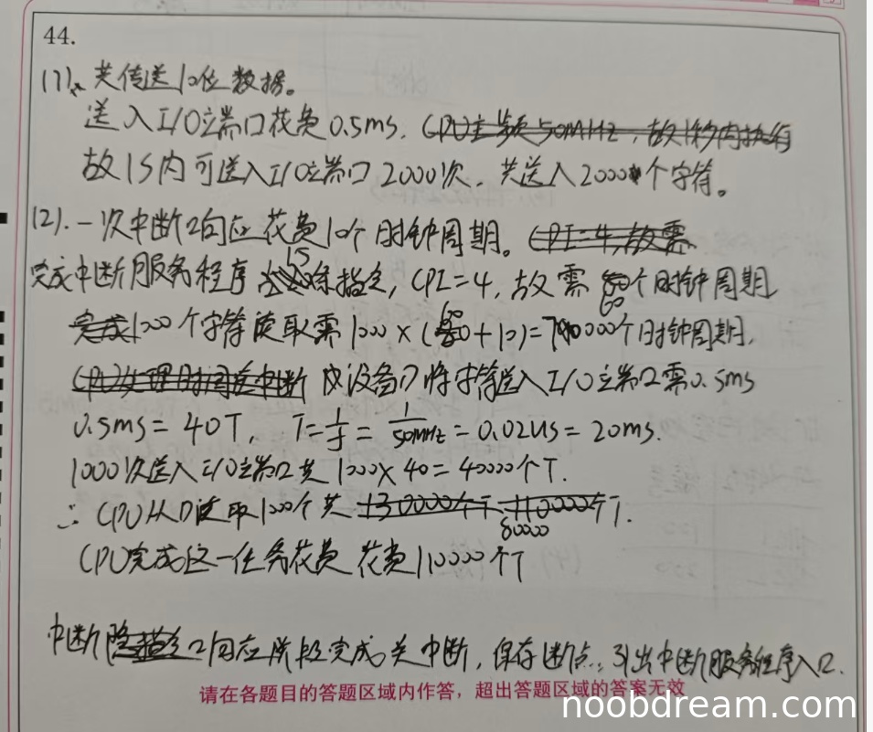第一问:学生计算完成1000个字符传送所需时钟周期。标准答案为25070000个时钟周期,学生第一次识别结果为70000,第二次识别结果为70000,均错误。主要错误在于中断服务程序执行时间计算不正确(第一次识别为60条指令,第二次识别为5条指令,但标准答案为20条指令,且仅前15条指令影响字符传送时间),且未正确计算设备D将字符送入I/O端口的时间(学生计算为40T,但标准答案为25000T)。逻辑错误扣分,本部分得0分。