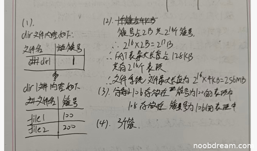 第一次识别结果中,dir文件内容将"dir1"误写为"dirl"(可能是识别错误),且簇号写为1(应为48),dir1文件内容正确;第二次识别结果中,dir文件内容将文件名误写为"dir"(应为"dir1"),簇号仍为1(应为48),dir1文件内容正确。根据禁止扣分规则,相似字符识别错误(如1和l、1和48)不扣分,但核心逻辑错误需扣分。dir文件内容中簇号错误(应为48,学生作答均为1)是逻辑错误,扣1分;dir1文件内容正确,得2分。本小题得2分。