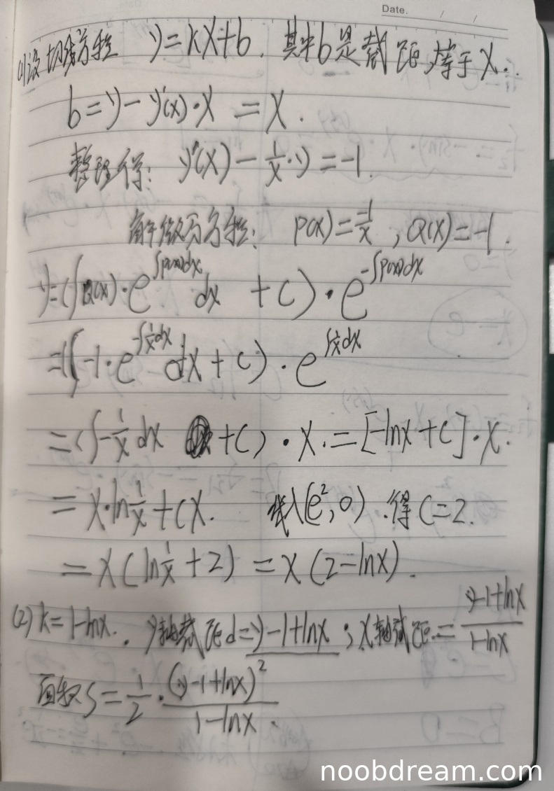 学生正确建立了微分方程:由切线在y轴截距等于点到y轴距离得到方程 \(y - xy' = x\),整理为 \(y' - \frac{1}{x}y = -1\)。虽然第一次识别中计算过程有跳步,第二次识别中出现了积分计算错误(计算 \(\int -x dx = -\frac{1}{2}x^2\)),但最终通过正确的方法得到了通解 \(y = x(C - \ln x)\),并利用初始条件 \(y(e^2) = 0\) 求出 \(C = 2\),得到正确答案 \(y(x) = x(2 - \ln x)\)。考虑到识别可能导致的错误,且核心逻辑正确,扣1分。