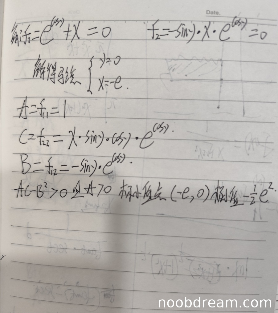 学生在判别式AC-B²=0时意识到需要进一步分析,这是正确的思路。但后续分析存在逻辑错误:将f(x,y)误写为z=e^(cos y)+x(实际上是fₓ),且极小值计算错误。标准答案中在(-e,0)处的极小值应为-e²/2,而学生得出0。这部分分析完全错误,扣4分。