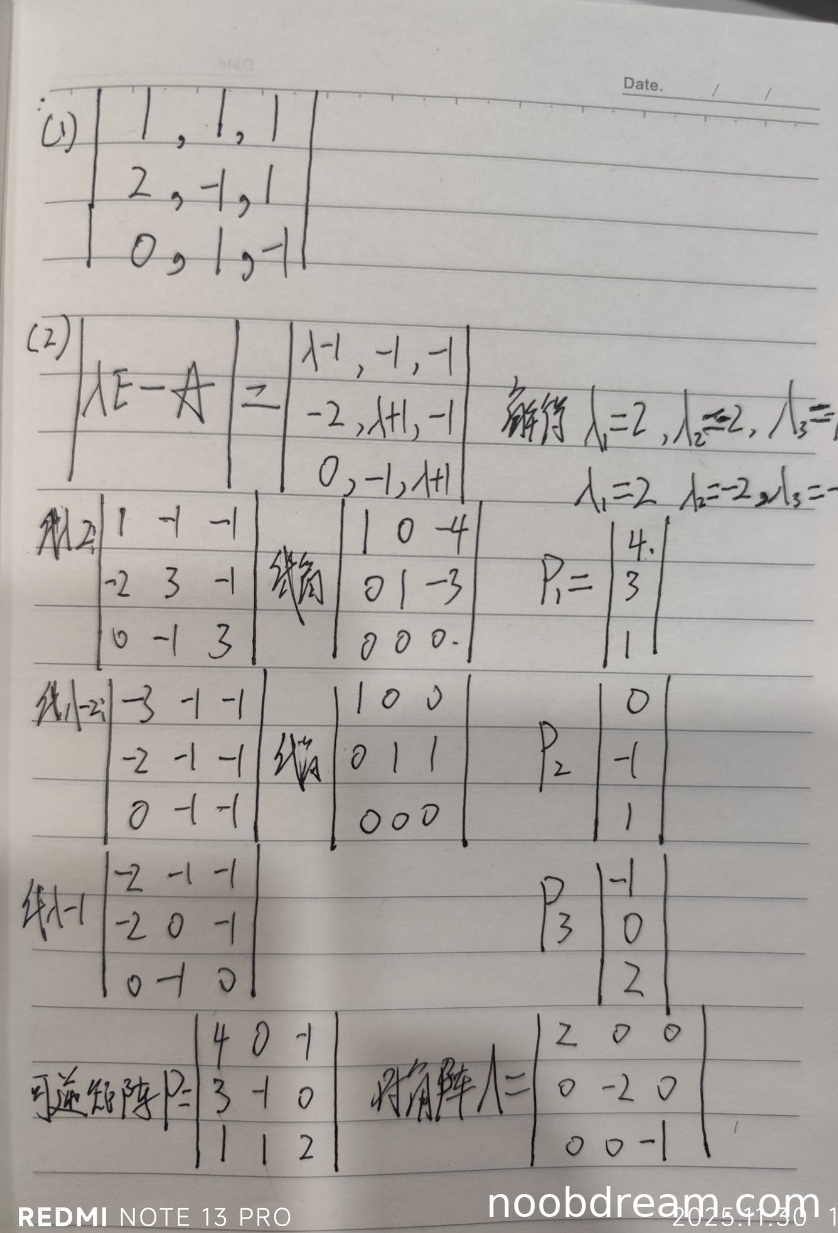- 但构造矩阵P时,特征向量的排列顺序与对角矩阵Λ的特征值顺序不匹配,这是逻辑错误,扣2分
