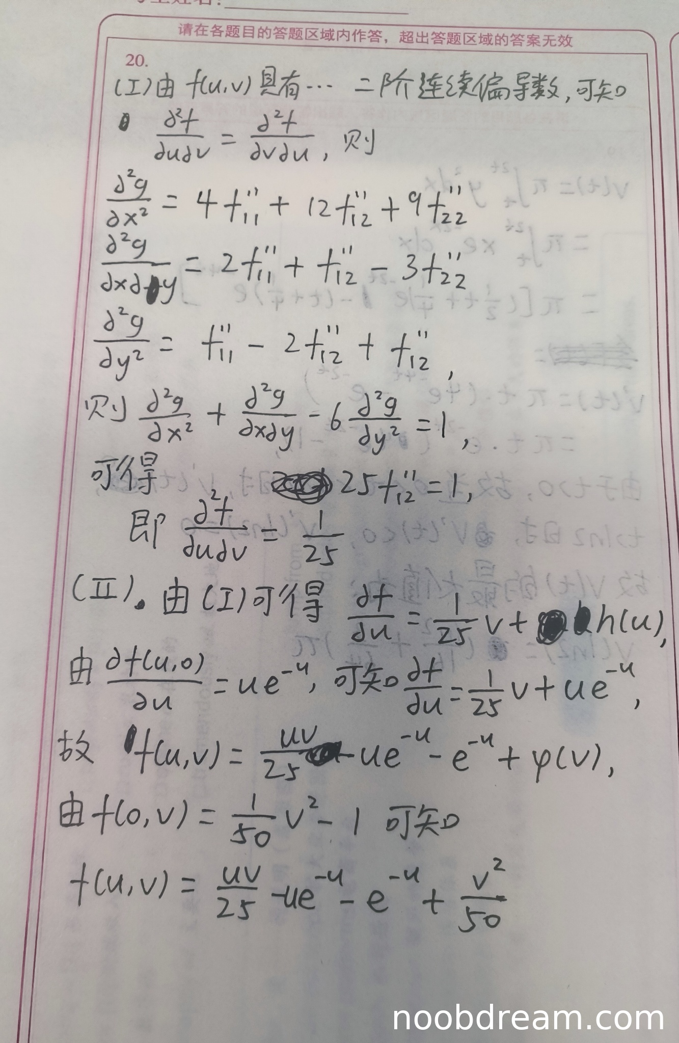 第1次识别中,由 \(\frac{\partial f}{\partial u} = \frac{1}{25}v + h(u)\) 和已知条件得到 \(h(u) = ue^{-u}\) 是正确的。积分得到 \(f(u,v) = \frac{uv}{25} - ue^{-u} - e^{-u} + \varphi(v)\),但积分过程中缺少积分常数项(即 \(-e^{-u}\) 应为对 \(ue^{-u}\) 积分的结果的一部分,但这里写法正确)。利用 \(f(0,v) = \frac{1}{50}v^2 - 1\) 确定 \(\varphi(v) = \frac{v^2}{50}\),最终表达式正确。得6分。