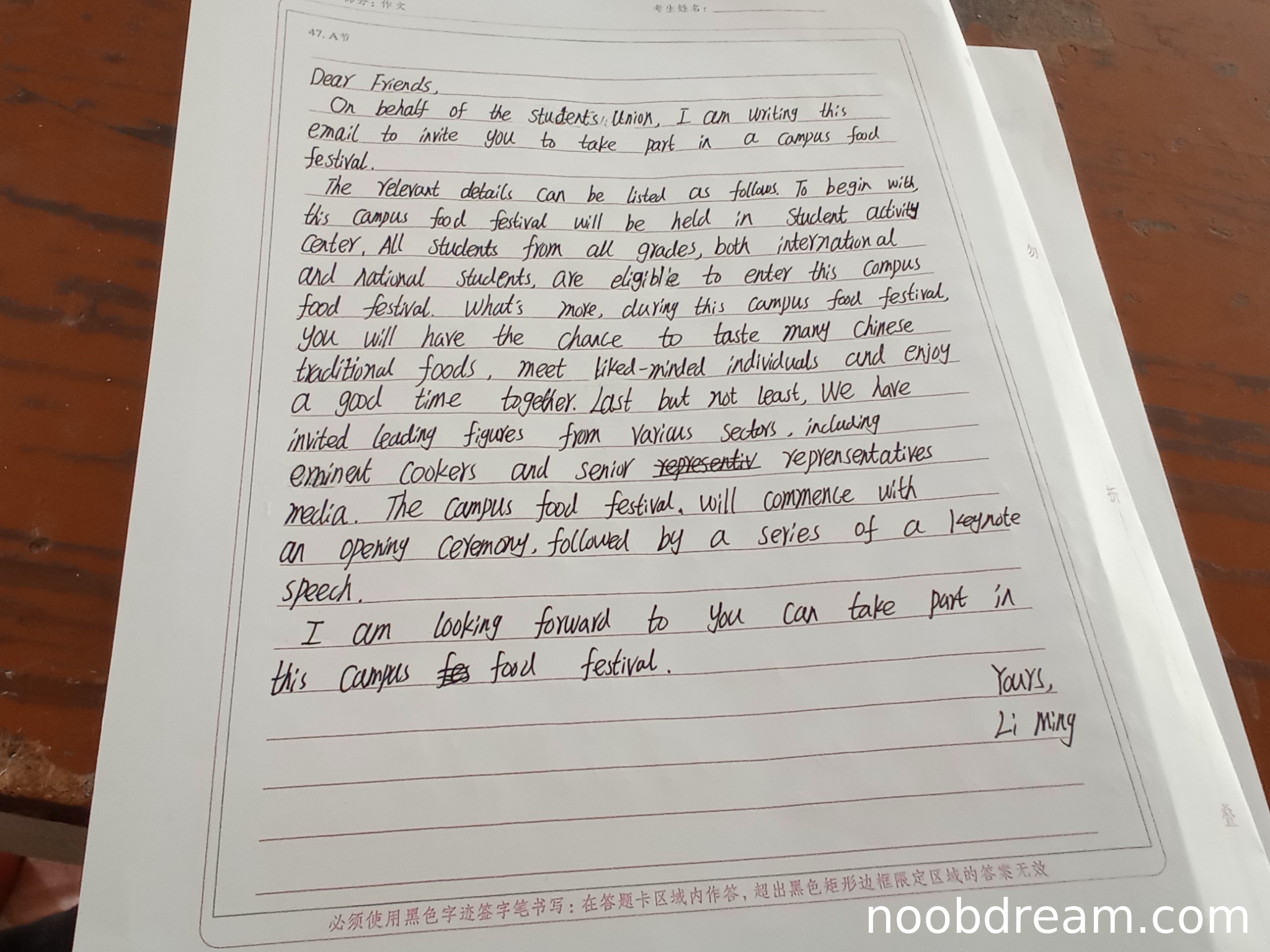 理由:格式完整正确,包含称呼、正文、结束语和签名。语域恰当,使用了正式但不生硬的书信语言,符合向国际学生发出邀请的语境。