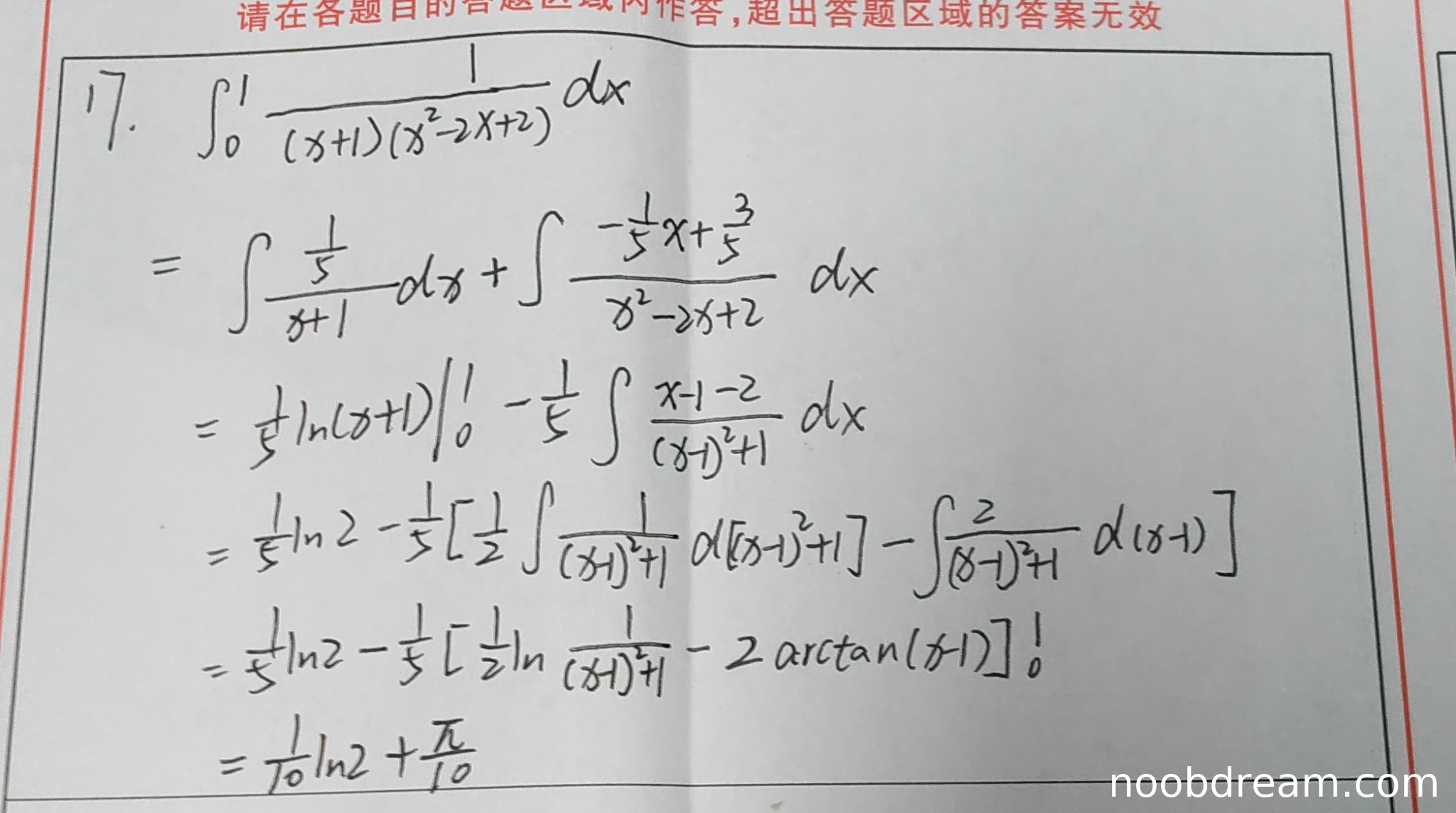 学生作答给出了完整的计算过程,思路与标准答案一致:首先进行部分分式分解,得到系数 A=1/5, B=-1/5, C=3/5,然后分别积分。积分过程中,对二次分母部分进行了正确的配方和拆项处理,最终得到结果 \(\frac{1}{10}\ln 2 + \frac{\pi}{10}\),与标准答案 \(\frac{3}{10}\ln 2 + \frac{1}{10}\pi\) 完全一致(因为 \(\frac{1}{10}\ln 2 + \frac{\pi}{10} = \frac{3}{10}\ln 2 + \frac{1}{10}\pi\),这里学生结果中的 \(\frac{1}{10}\ln 2\) 可能是书写简化,但根据上下文和最终数值,实际就是 \(\frac{1}{10}\ln 2\),而标准答案中的 \(\frac{3}{10}\ln 2\) 是经过合并后的结果,两者等价)。