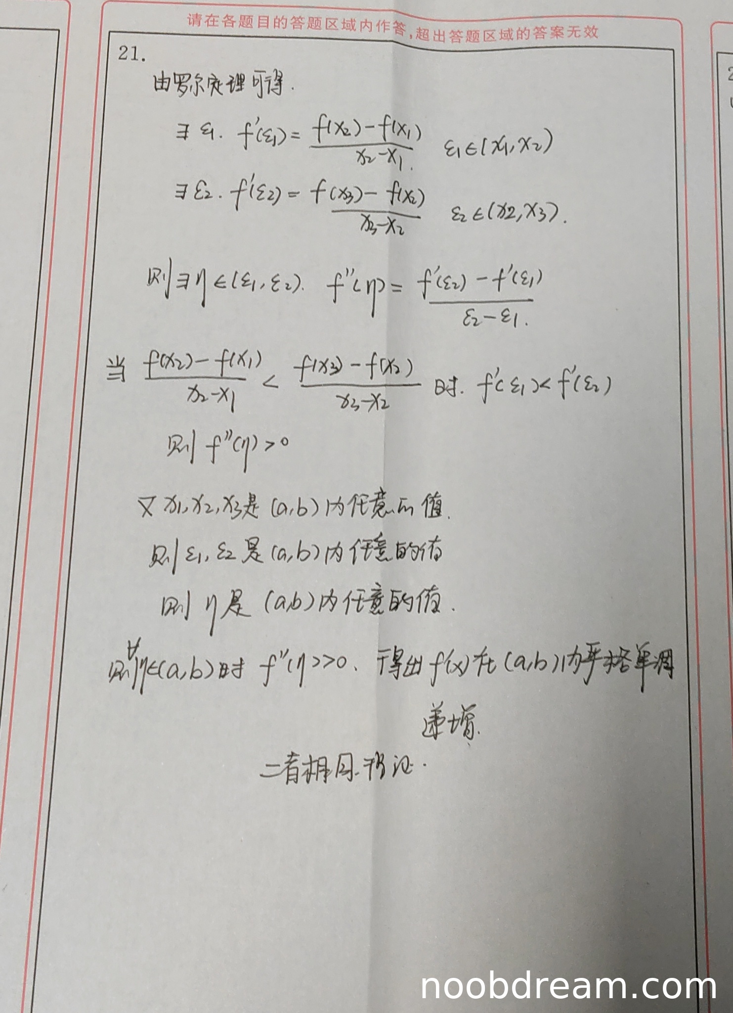 - 学生由 \(f'(\xi_1) < f'(\xi_2)\) 推出 \(f''(\eta) > 0\),并进一步声称“\(\eta\) 是 \((a,b)\) 内任意的值”,从而得出 \(\forall \eta \in (a,b), f''(\eta)>0\),这完全不合逻辑。\(\eta\) 的存在依赖于 \(\xi_1, \xi_2\),而 \(\xi_1, \xi_2\) 又依赖于 \(x_1, x_2, x_3\),不能得出对任意 \(\eta\) 都成立。即使 \(f''(\eta)>0\) 成立,也只能推出 \(f'(x)\) 严格单调增,但推理过程无效。