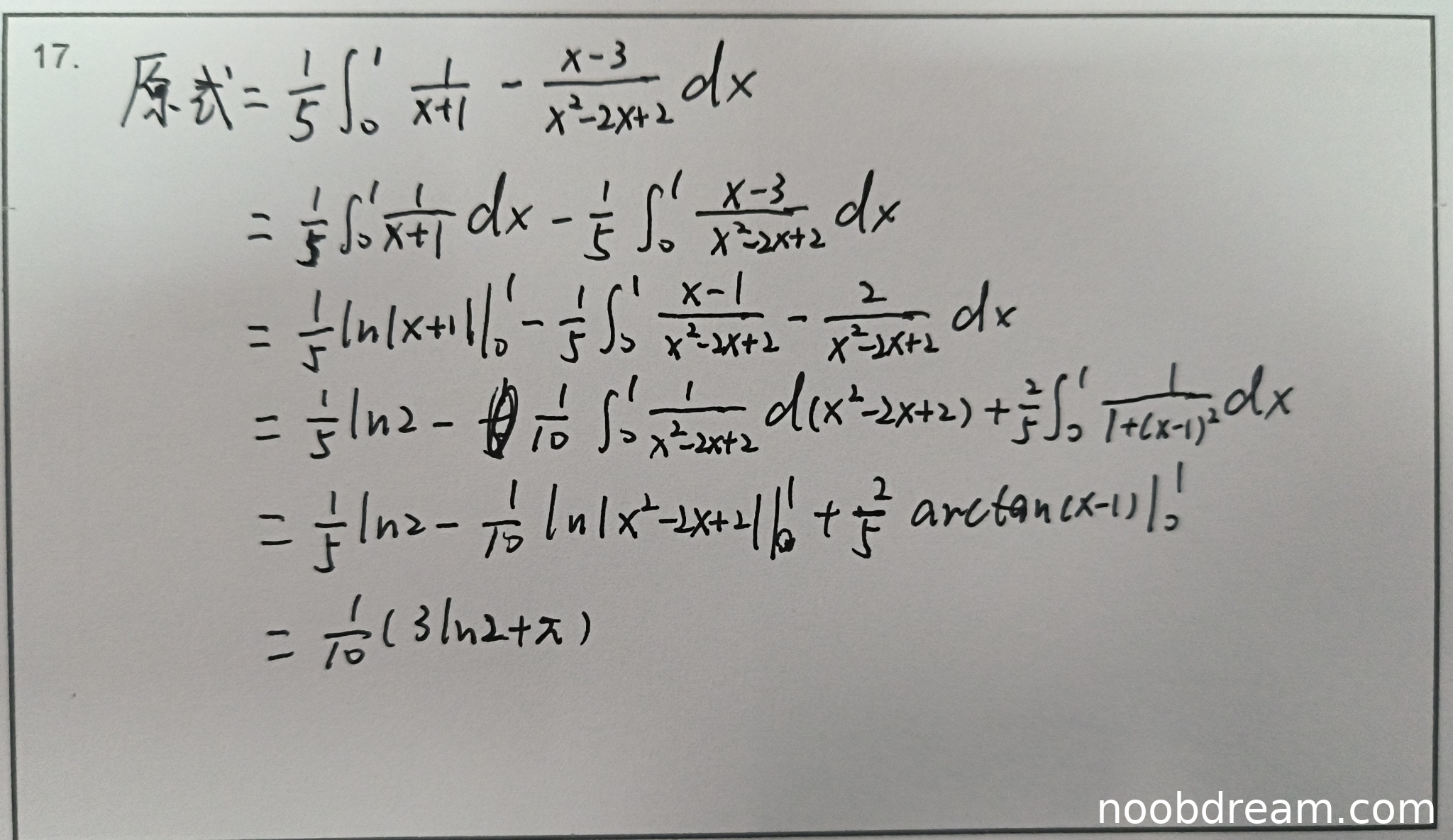 学生作答给出了两次识别结果,但两次内容本质相同,都是对原积分进行部分分式分解后分别计算。解题思路与标准答案完全一致:先分解为 \(\frac{A}{x+1} + \frac{Bx+C}{x^2-2x+2}\),然后分别积分。在计算过程中,学生正确得到了部分分式系数(第一次识别中写为 \(\frac{1}{5}\int_{0}^{1}\frac{1}{x+1}-\frac{x-3}{x^2-2x+2}dx\),这与标准答案中的 \(\frac{1/5}{x+1} + \frac{-\frac{1}{5}x+\frac{3}{5}}{x^2-2x+2}\) 等价,因为 \(-\frac{x-3}{5} = -\frac{1}{5}x + \frac{3}{5}\))。后续积分步骤正确,包括将分子拆分为 \((x-1)-2\),分别处理对数积分和反正切积分,代入上下限计算,最终结果 \(\frac{1}{10}(3\ln 2 + \pi)\) 与标准答案 \(\frac{3}{10}\ln 2 + \frac{1}{10}\pi\) 完全相同。