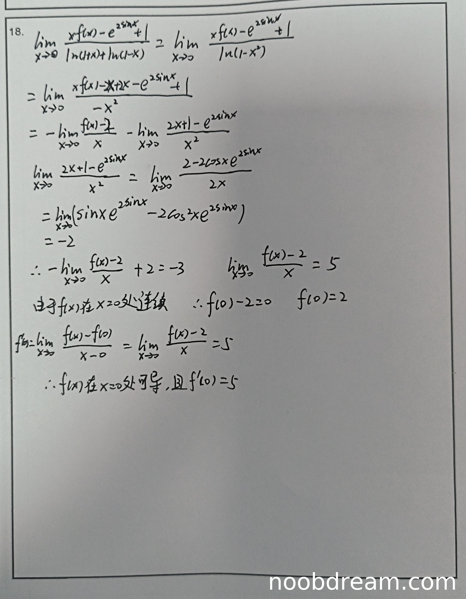 - 利用连续性求 \(f(0)\) 正确:由 \(\lim\limits_{x \to 0}\frac{f(x)-2}{x} = 5\) 可知该极限存在,其分子必趋于0,故 \(\lim\limits_{x \to 0} f(x) = 2\)。结合题目条件 \(f(x)\) 在 \(x=0\) 处连续,得出 \(f(0)=2\)。推理正确。