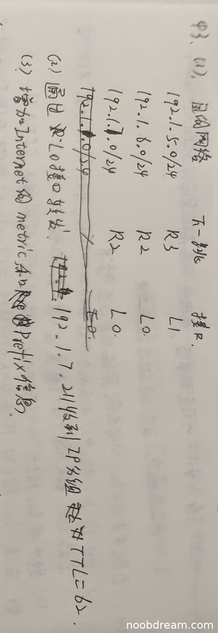 问题有两问:转发接口和收到的TTL值。学生第一次识别结果提到“圆边 R-Lodge0 发送”,疑似指通过L0接口转发,但表述不清。TTL计算为62。第二次识别结果明确“通过R - Lo接口转发”,TTL=62。标准答案为通过L0接口转发,TTL=61(经过3个路由器R1、R2、R4)。学生答案的转发接口判断正确(L0),但TTL计算错误(应为64-3=61,学生得62)。转发接口正确给1分,TTL计算错误扣1分。得分:1分。