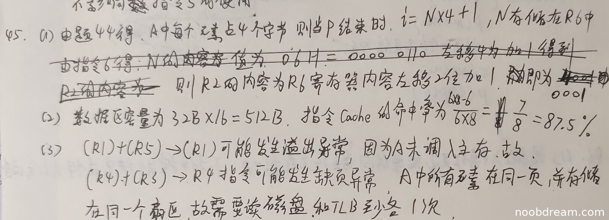 ② 对于可能产生缺页异常的指令:学生指出“(R4)+(R3)→R4”可能发生缺页异常。根据标准答案,只有访存指令(load)可能缺页,即指令3。学生给出的指令描述不准确,但根据上下文可能意指访存指令,且标准答案评分说明中回答“load指令”即可得分,此处酌情给1分。