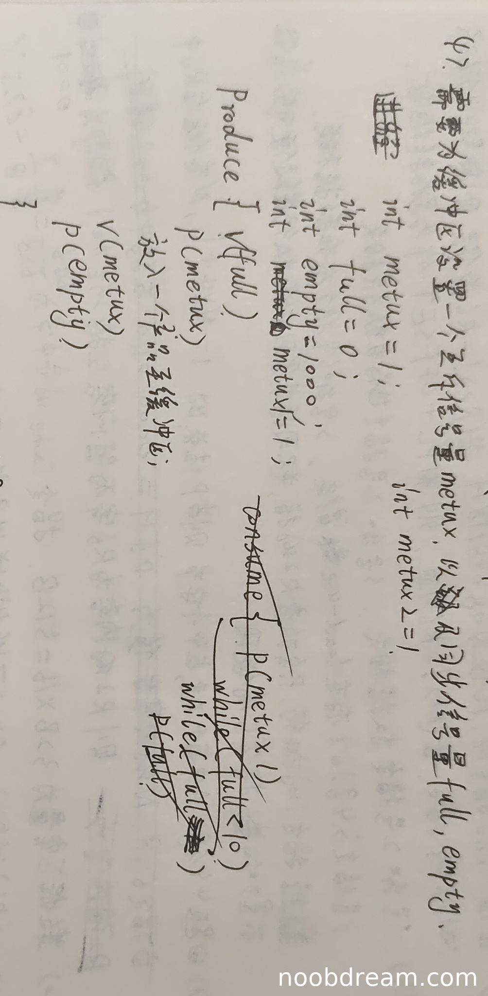 10)进行判断,但full是信号量,不能直接与整数比较,且p/v操作使用错误。第二次识别的代码是经典消费者模型,完全没有实现“连续取10件”的互斥控制。因此,消费者进程的实现不能得分。