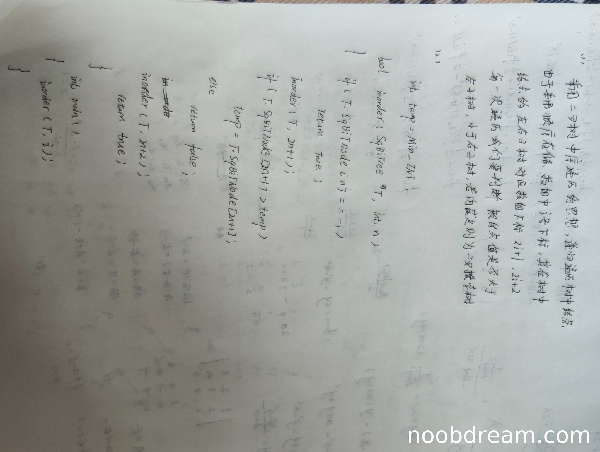 3. 递归调用逻辑错误:第一个inorder函数中递归调用前未保存前驱值,直接比较T->SqBitNode[2n+1]与temp,而temp未更新;第二个inorder函数中递归调用顺序和下标计算有误(从1开始且使用i-1)。