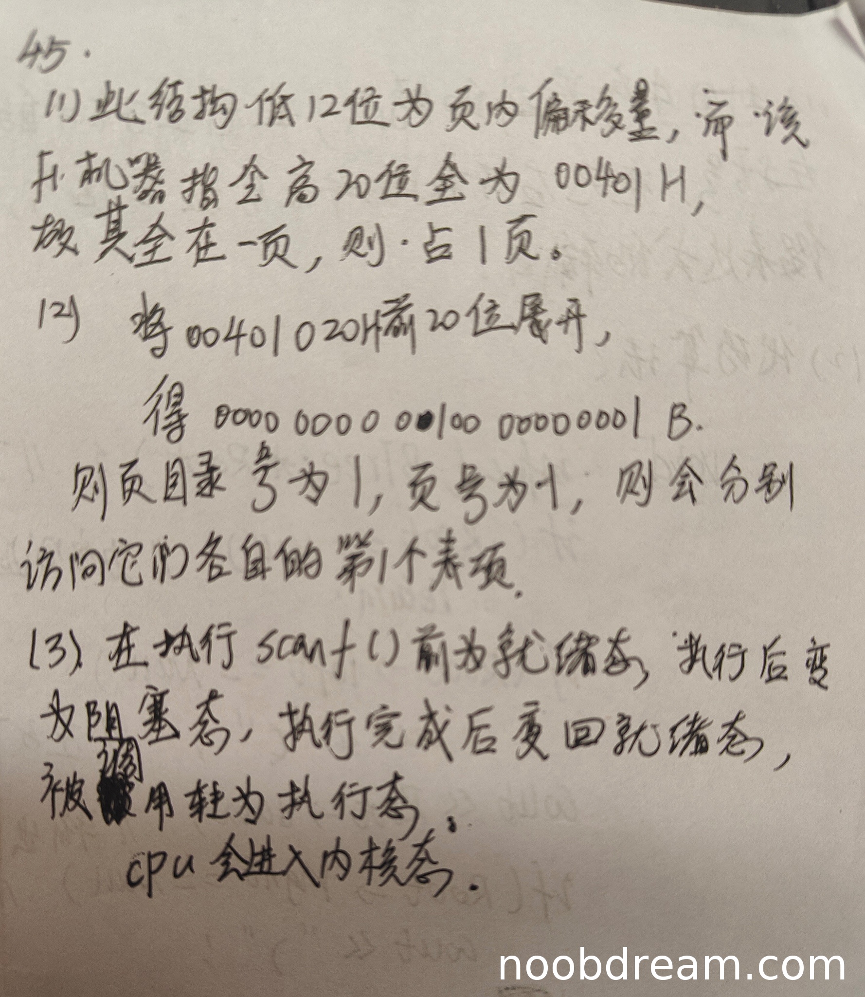 学生回答基本正确,但状态变化描述不够完整。标准答案要求描述从执行态变为阻塞态,再被唤醒为就绪态,最后被调度为运行态。学生回答中“在执行scanf()前为就绪态”不准确(调用scanf时进程应处于运行态),但后续“执行后变为阻塞态,执行完成后变回就绪态,被调用转为执行态”基本涵盖了状态变化过程,且明确CPU会进入内核态。考虑到识别可能造成的表述细节偏差,核心逻辑正确,扣1分。得3分。