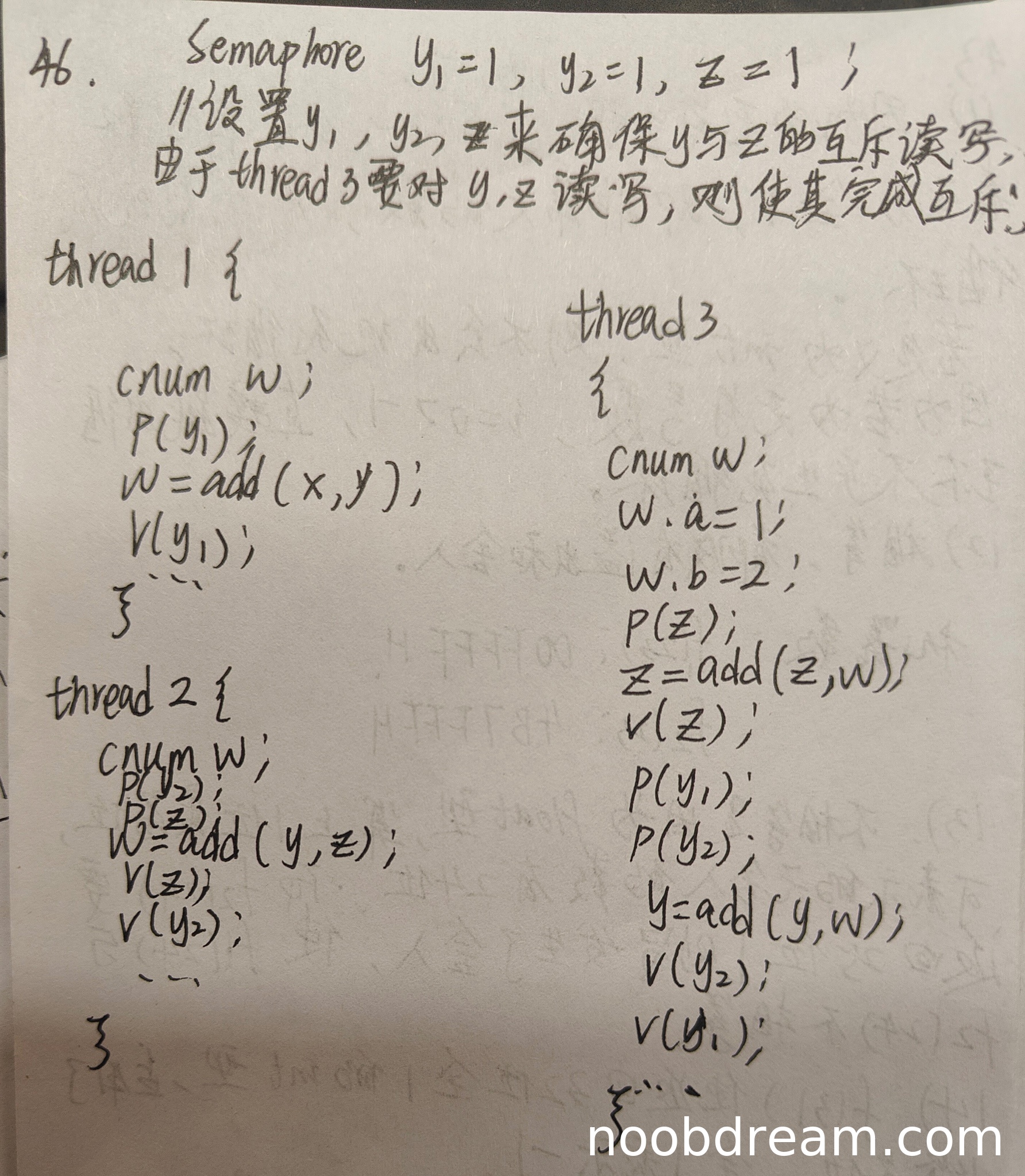 理由:thread2 需要访问 y 和 z。学生正确地在 add(y, z) 前对 y2 和 z 信号量进行了 P 操作(注意:第二次识别结果中包含了 P(z),这是正确的;第一次识别结果漏了 P(z),但根据“两次识别只要一次正确则不扣分”的原则,以正确版本为准),并在操作后进行了对应的 V 操作,确保了与 thread3 对 y 和 z 的互斥访问,且顺序合理,未造成死锁。