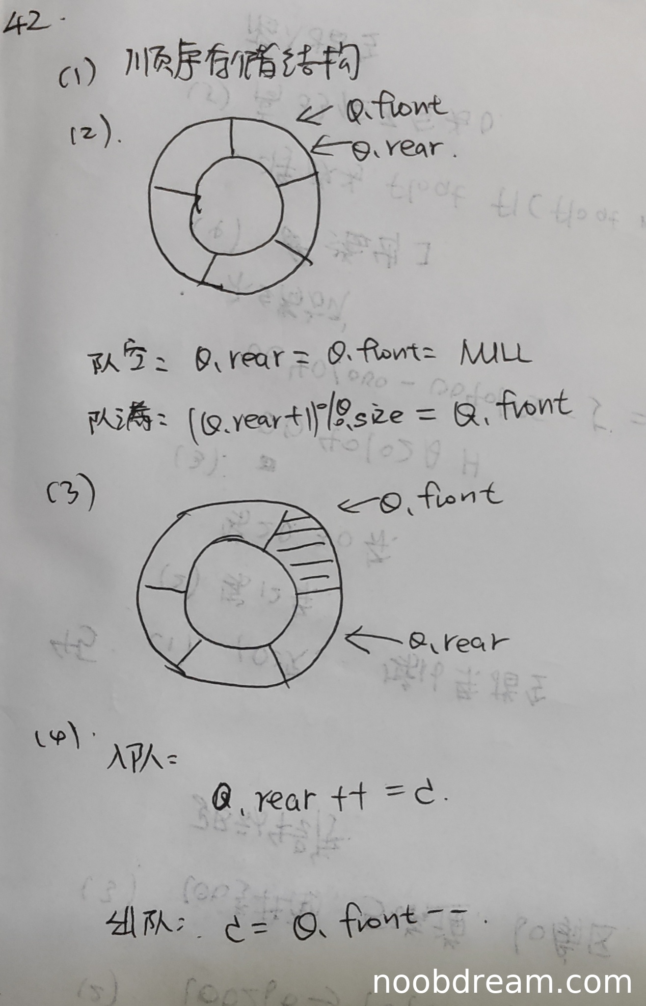 学生给出了顺序存储结构下的队空和队满条件。队空条件为“Q.rear = Q.front = NULL”,这在顺序存储中通常不这样表示(顺序存储常用数组,front和rear是下标,初始为0或-1,NULL一般用于指针)。队满条件为“(Q.rear + 1) % size = Q.front”,这是循环队列的经典判断方法,但前提是数组大小固定。然而,题目要求“入队时允许增加队列占用空间”,即队列大小可变,这与固定size的循环队列矛盾。学生答案未体现空间动态增长且只增不减的特性,且初始状态描述不准确(未画出初始状态图)。因此,本部分答案不符合题目要求,得0分。