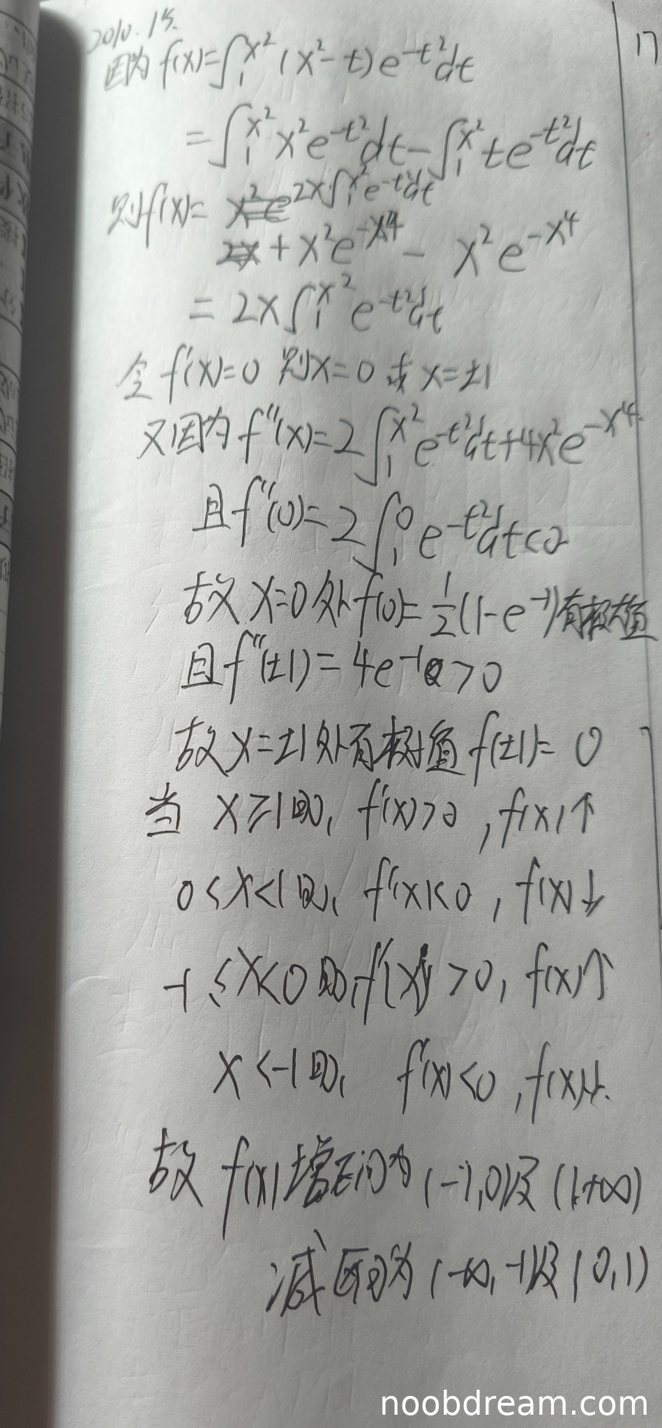 - 积分下限错误:题目中函数定义为 \(f(x)=\int_{-\infty}^{x^{2}}(x^{2}-t) e^{-t^{2}} dt\),而学生两次识别结果均将积分下限误写为1(即 \(\int_{1}^{x^{2}}\))。这是一个根本性的错误,改变了函数的定义,导致后续所有推导(包括导数、驻点、极值、单调区间)均建立在错误的基础上。此为核心逻辑错误,扣5分。