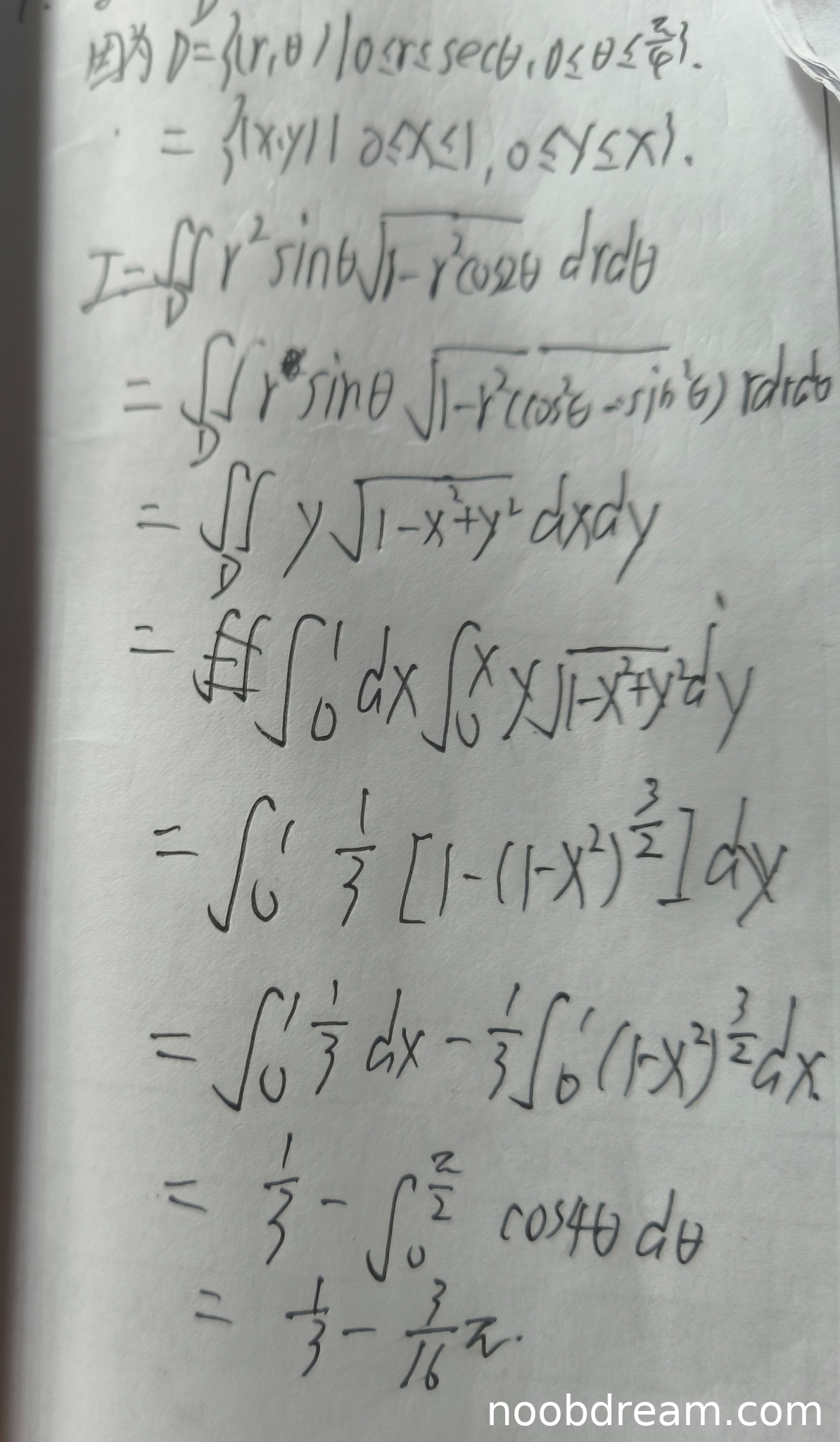 在第二次识别结果中,学生的解题思路与标准答案完全一致:正确地将极坐标积分转化为直角坐标积分,积分区域正确地转化为0≤x≤1, 0≤y≤x,被积函数正确地转化为y√(1-x²+y²)。后续计算中,对y的积分处理正确,得到(1/3)[1-(1-x²)^(3/2)]。在计算关于x的积分时,学生写出了∫₀¹ (1/3)dx - (1/3)∫₀¹ (1-x²)^(3/2)dx,但下一步直接跳到了“=1/3 - ∫₀^(π/2) cos⁴θ dθ”,这里省略了系数1/3,且换元过程未写明。最终结果计算为1/3 - (3π/16),这与标准答案1/3 - π/16不符,因为(1/3)*(3π/16)=π/16,而学生写成了3π/16,这是一个计算错误。