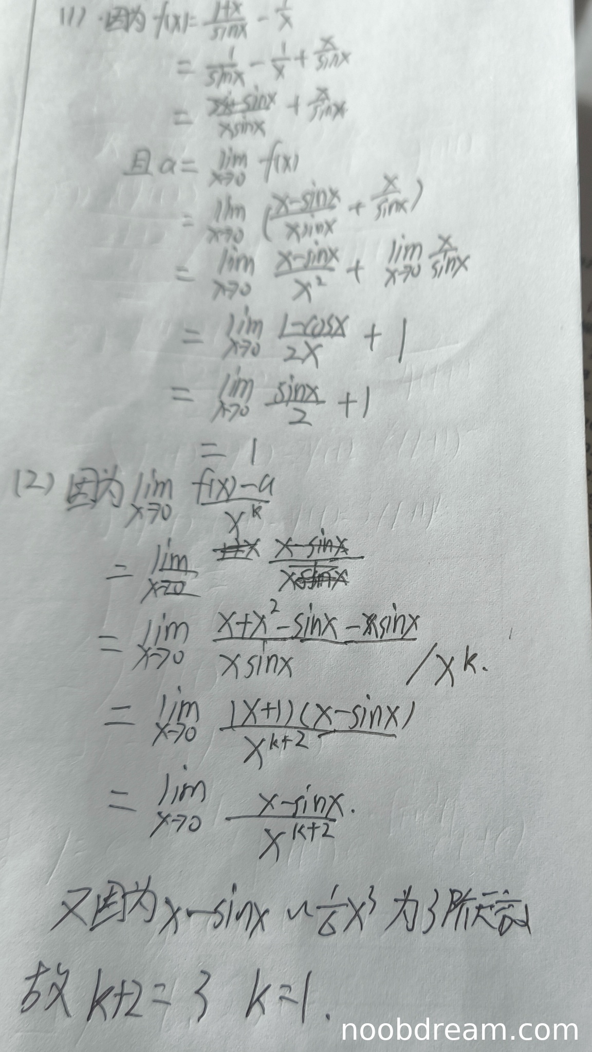 第二问中,学生正确写出 \( \lim_{x \to 0} \frac{f(x)-a}{x^k} \) 的表达式,通过通分化简得到 \( \lim_{x \to 0} \frac{x + x^2 - \sin x - x \sin x}{x \sin x \cdot x^k} \),并进一步化为 \( \lim_{x \to 0} \frac{(x+1)(x-\sin x)}{x^{k+2}} \)。注意到 \( x - \sin x \sim \frac{1}{6}x^3 \),因此得到 \( k+2 = 3 \),即 \( k = 1 \)。推导过程完整,与标准答案一致,逻辑正确。得5分。