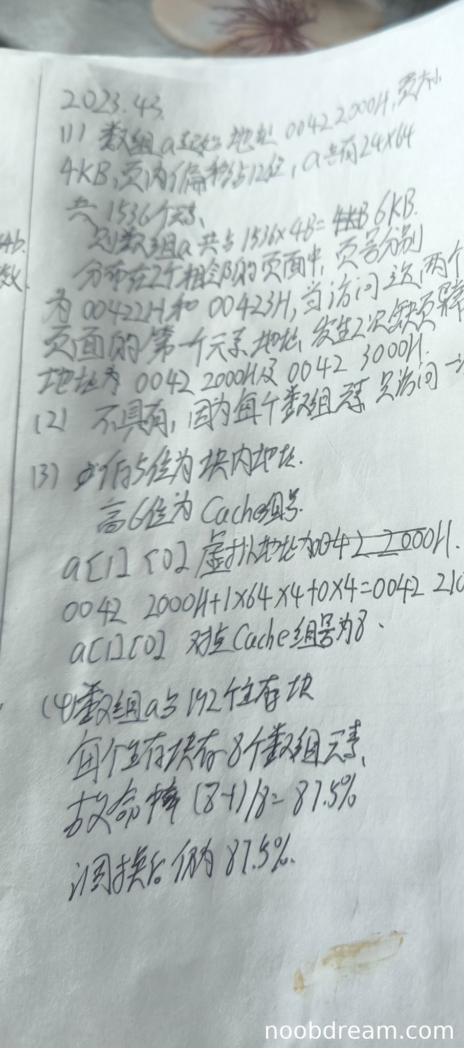 理由:学生答案正确计算出数组a大小为6KB,分布在2个页面中,会发生2次缺页异常,且两个页故障地址正确。虽然第一次识别结果中有“00422××04”等疑似识别错误的表述,但结合上下文和第二次识别结果,核心逻辑完全正确,因此给满分。