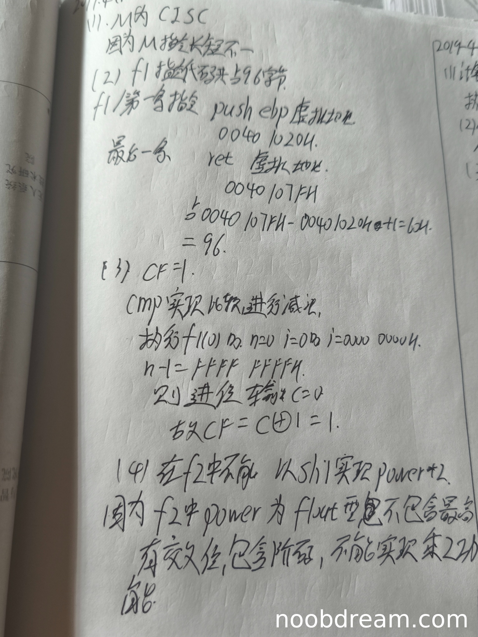 学生答案得出CF=1,且解释基本正确(cmp进行减法,n=0时n-1为FFFFFFFFH,进位输出C=0,CF=C⊕1=1)。虽然识别中出现了“i=0x00000004”等误写,但核心逻辑正确,且最终结果与过程符合标准答案。根据“误写不扣分”原则,得3分。