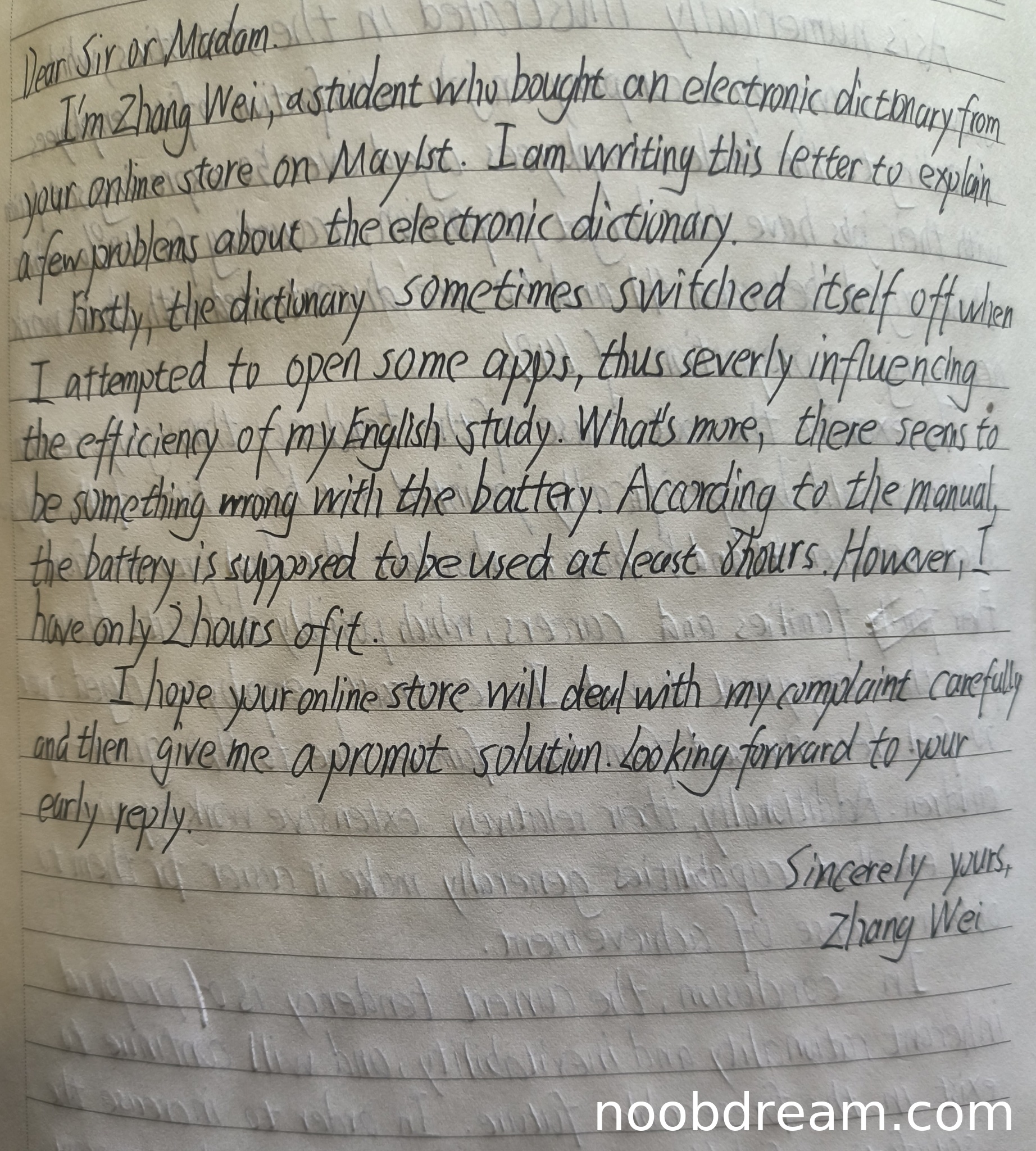 - 格式与语域:格式完全正确,包含称呼、正文、结束语和签名。语域(正式书信)非常恰当,使用了“Dear Sir or Madam”、“Sincerely yours”等标准表达。