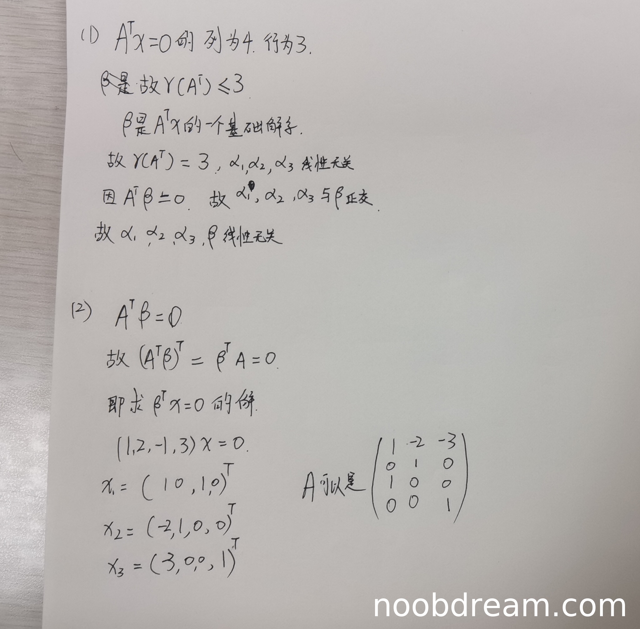 - 学生正确理解到 \(A^T\beta = 0\) 等价于 \(\beta^T A = 0\),因此 \(A\) 的列向量是方程 \(\beta^T x = 0\) 的解。这个思路正确,得1分。