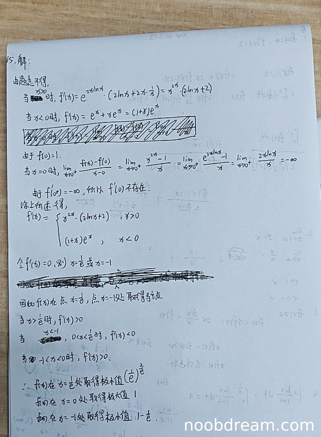 - 当 \(x>0\) 时,\(f'(x)=x^{2x}(2\ln x+2)\),等价于标准答案中的 \(2 e^{2 x \ln x}(\ln x+1)\)(注意 \(2\ln x+2=2(\ln x+1)\),且 \(x^{2x}=e^{2x\ln x}\),因此两者一致)。