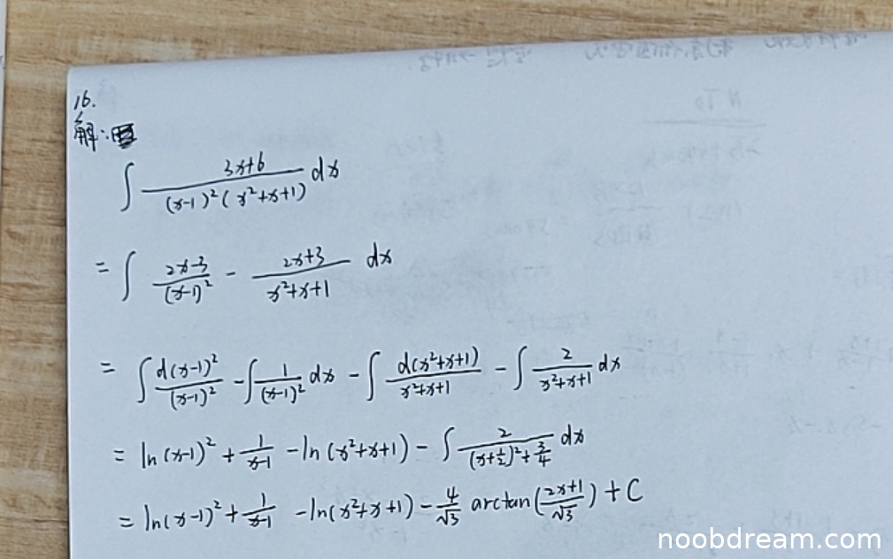 - 部分分式分解错误(扣3分):学生给出的分解形式为 \(\frac{2x-3}{(x-1)^2} - \frac{2x+3}{x^2+x+1}\)。正确的分解应设为 \(\frac{A}{x-1} + \frac{B}{(x-1)^2} + \frac{Cx+D}{x^2+x+1}\)。通过通分比较系数,可解得 \(A = -2, B = -3, C = 2, D = 3\)。因此,正确的分解应为 \(-\frac{2}{x-1} - \frac{3}{(x-1)^2} + \frac{2x+3}{x^2+x+1}\)。学生的分解从第一步就错了,这是根本性的逻辑错误。