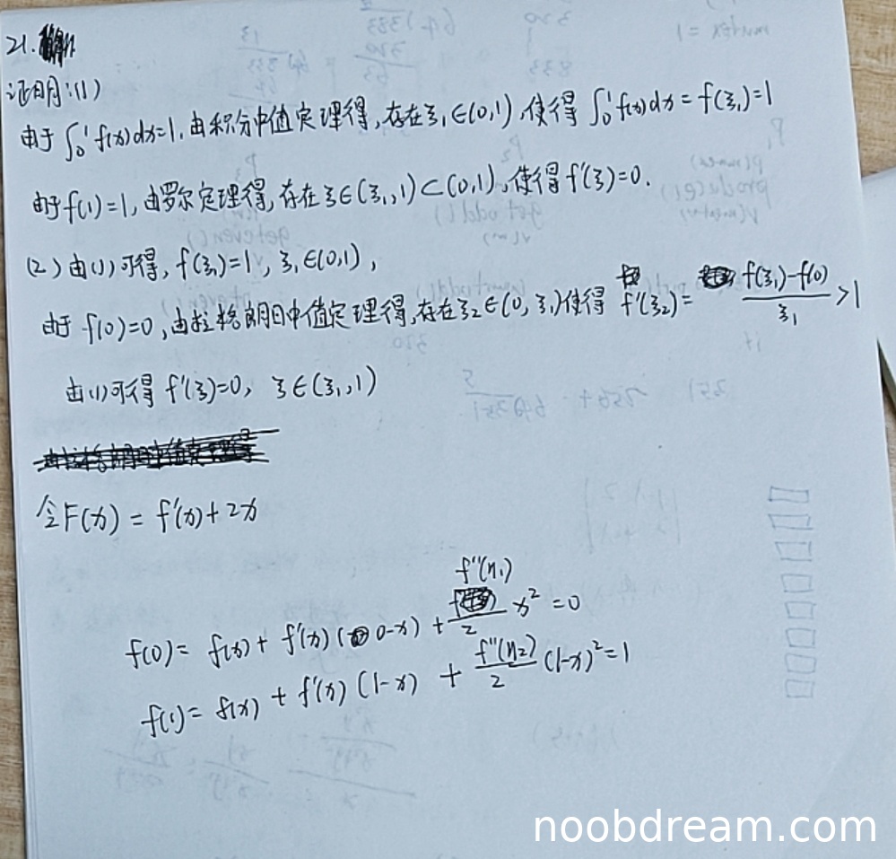 得分:2分(给予部分分数是因为正确得到了 \(f'(\xi_2)>1\) 和 \(f'(\xi)=0\),这是关键步骤,但后续证明不完整且存在错误推导)。