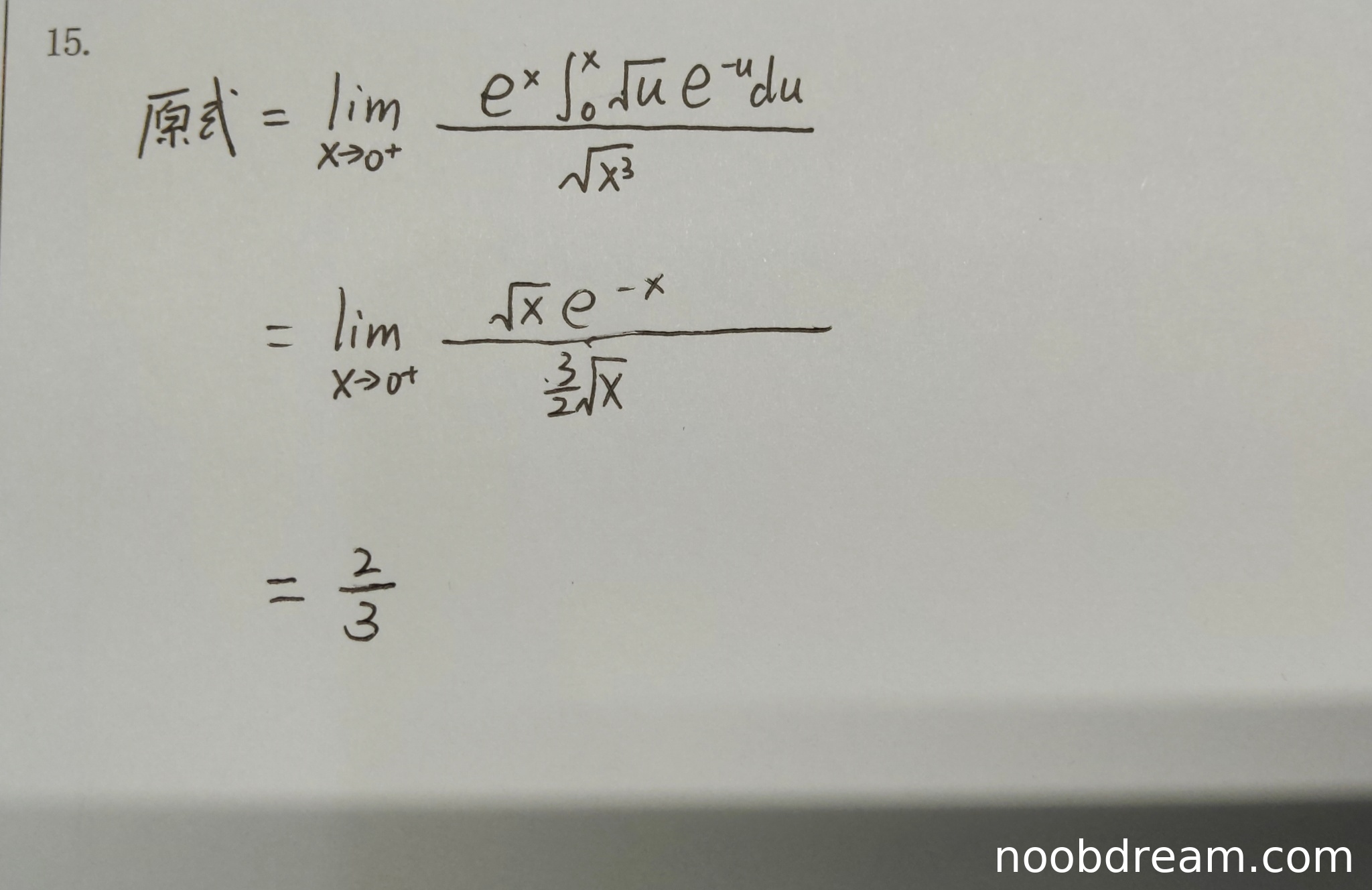 然而,在第二次识别的详细推导中,存在一个关键的逻辑/书写错误:在应用洛必达法则对分子 \( y = e^x \int_0^x \sqrt{u} e^{-u} du \) 求导后,正确的导数应为 \( y' = e^x \int_0^x \sqrt{u} e^{-u} du + e^x \cdot (\sqrt{x} e^{-x}) = e^x \int_0^x \sqrt{u} e^{-u} du + \sqrt{x} \)。但在后续等式中,学生写的是“\( e^x \int_0^x \sqrt{u} e^{-u} du + \sqrt{x} e^{-x} \)”,这里多了一个 \( e^{-x} \)(应为 \( +\sqrt{x} \)),这导致后续极限化简时,分子变成了 \( \sqrt{x} e^{-x} \) 而不是 \( \sqrt{x} \)。虽然巧合的是,\( \lim_{x \to 0^+} e^{-x} = 1 \),所以最终数值结果仍然是 \(\frac{2}{3}\),但这个推导过程中的表达式是错误的,属于逻辑错误。