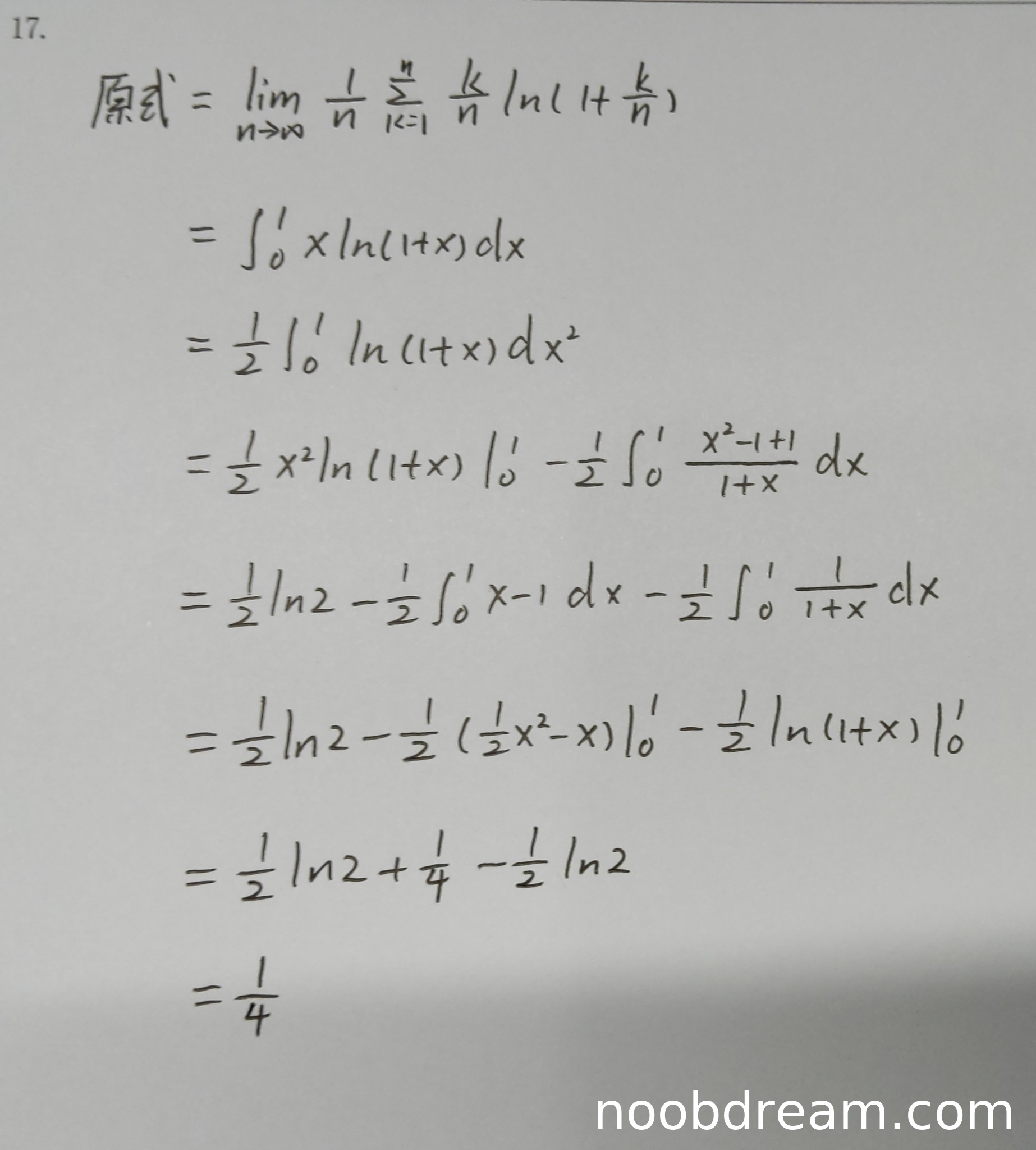 - 核心思路与步骤完全正确:学生准确地将极限问题转化为定积分 \(\int_{0}^{1} x \ln(1+x) dx\),这是解题的关键且正确。