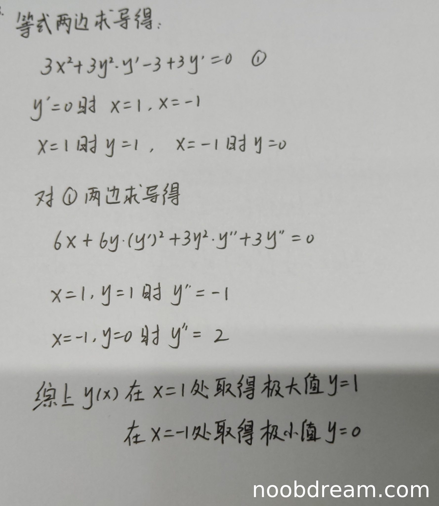学生作答与标准答案完全一致。具体步骤包括:对原方程两边求导得到一阶导数表达式;令 \(y'=0\) 解得 \(x=\pm 1\);将 \(x=\pm 1\) 代入原方程得到对应点 \((1,1)\) 和 \((-1,0)\);对一阶导表达式再次求导得到二阶导表达式;代入两点计算二阶导数值,并根据符号判断极值类型(\(y''(1)=-1<0\) 为极大值,\(y''(-1)=2>0\) 为极小值);最终给出正确结论。整个解答过程逻辑清晰,计算无误。根据打分要求,思路正确且无逻辑错误,应给满分。