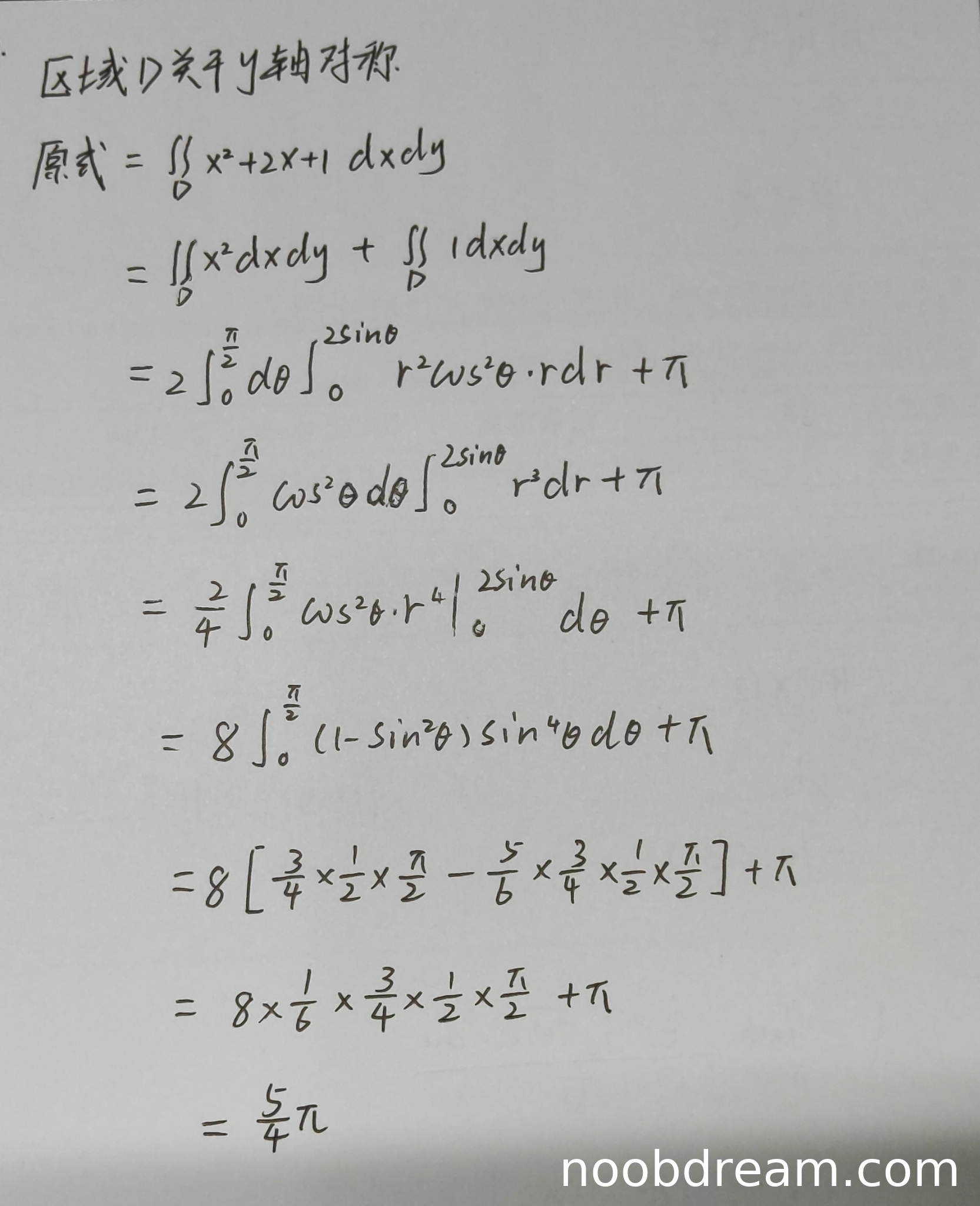 - 正确利用区域D关于y轴对称,指出\(2x\)为奇函数,因此\(\iint_D 2x \, dxdy = 0\),从而原式简化为\(\iint_D x^2 \, dxdy + \iint_D 1 \, dxdy\)。