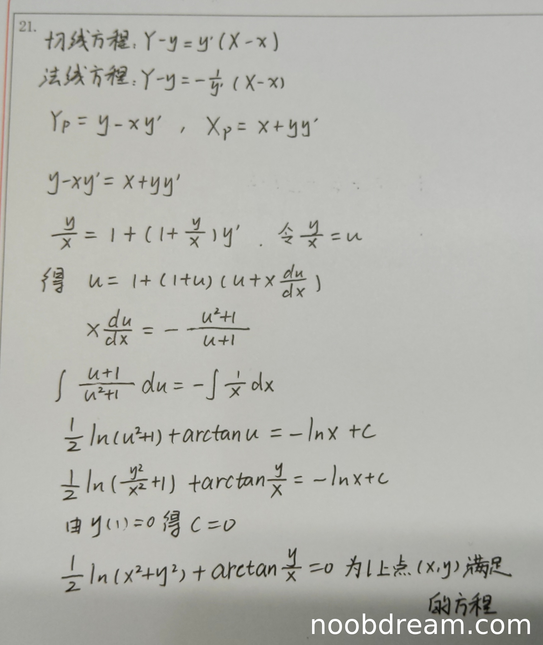 - 最终正确得出曲线方程 \(\frac{1}{2}\ln(x^2+y^2) + \arctan\frac{y}{x} = 0\)。