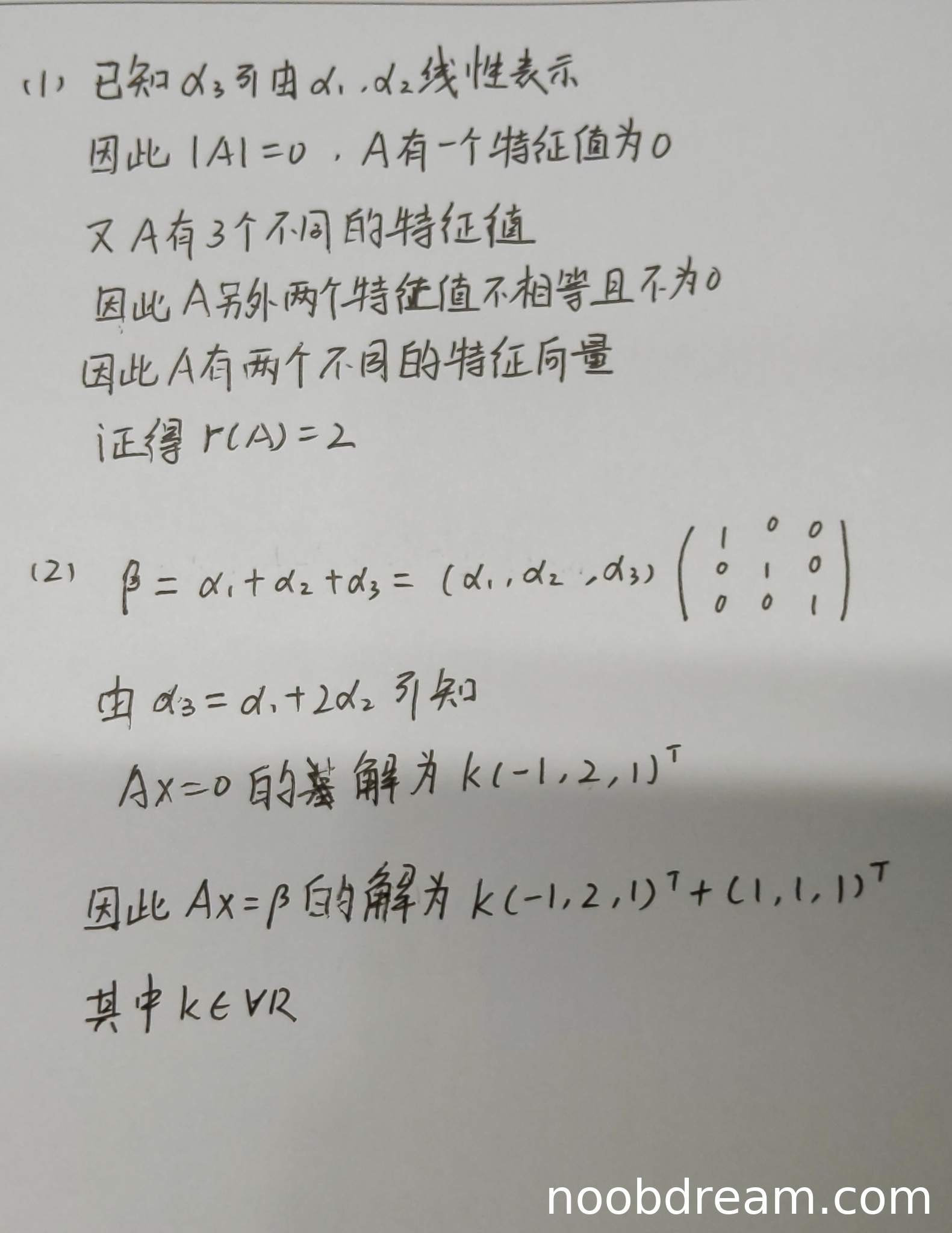 - 但最后一句“因此 A 有两个不同的特征向量”表述不严谨(特征向量有无穷多个,应说“两个非零特征值对应两个线性无关的特征向量”,或直接利用相似对角化得到 r(A)=2)。不过核心逻辑正确:因为三个特征值中只有一个 0,所以非零特征值个数为 2,从而秩为 2。