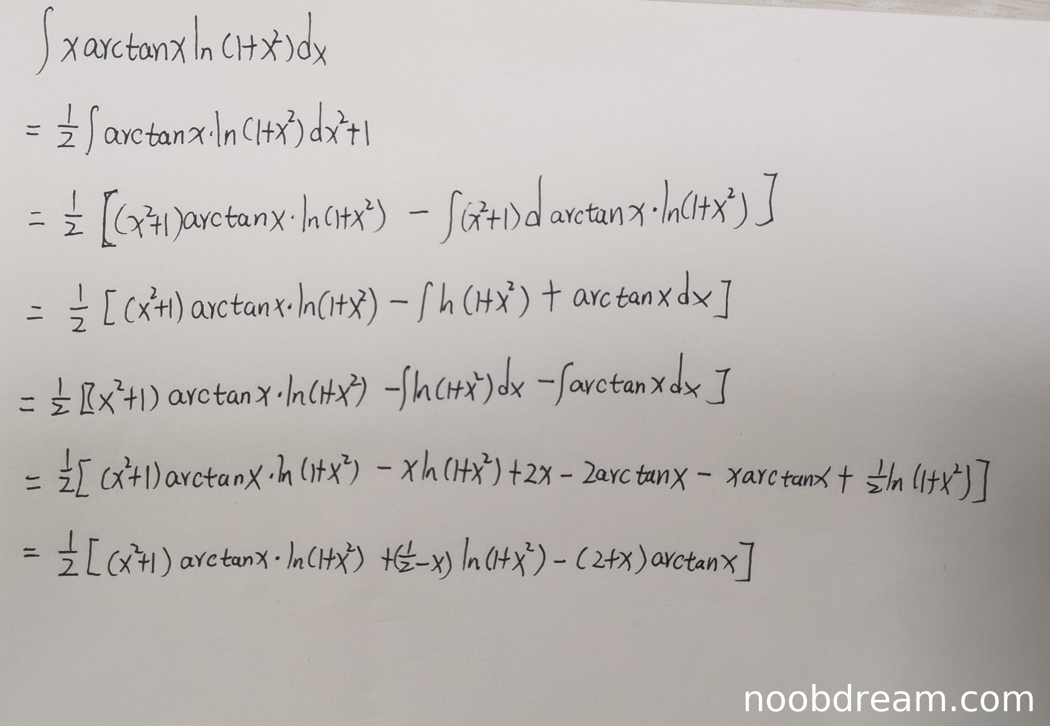 - 计算过程与结果错误:由于上述根本性的方法错误,后续代入计算即使个别积分(如 \(\int \ln(1+x^2)dx\) 和 \(\int \arctan x dx\))结果正确,但整体推导框架错误,导致最终结果 \(\frac{1}{2}[(x^{2}+1)\arctan x\cdot\ln(1 + x^{2})+(\frac{1}{2}-x)\ln(1 + x^{2})-(2 + x)\arctan x]+C\) 与标准答案不符。