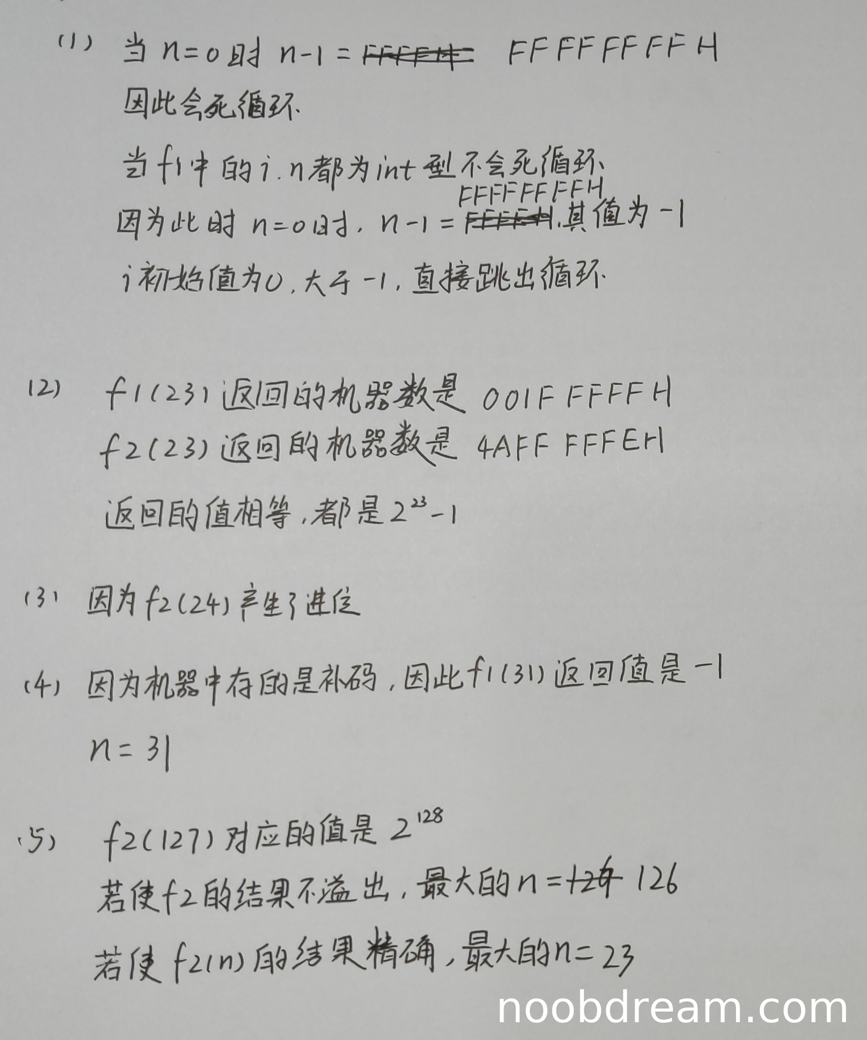 学生正确解释 f1(31) 返回 -1 是因为补码表示,但未说明 f(31) 超出 int 表示范围。第二问学生回答 n=31 错误,应为 n=30。第二问完全错误,扣 1 分。