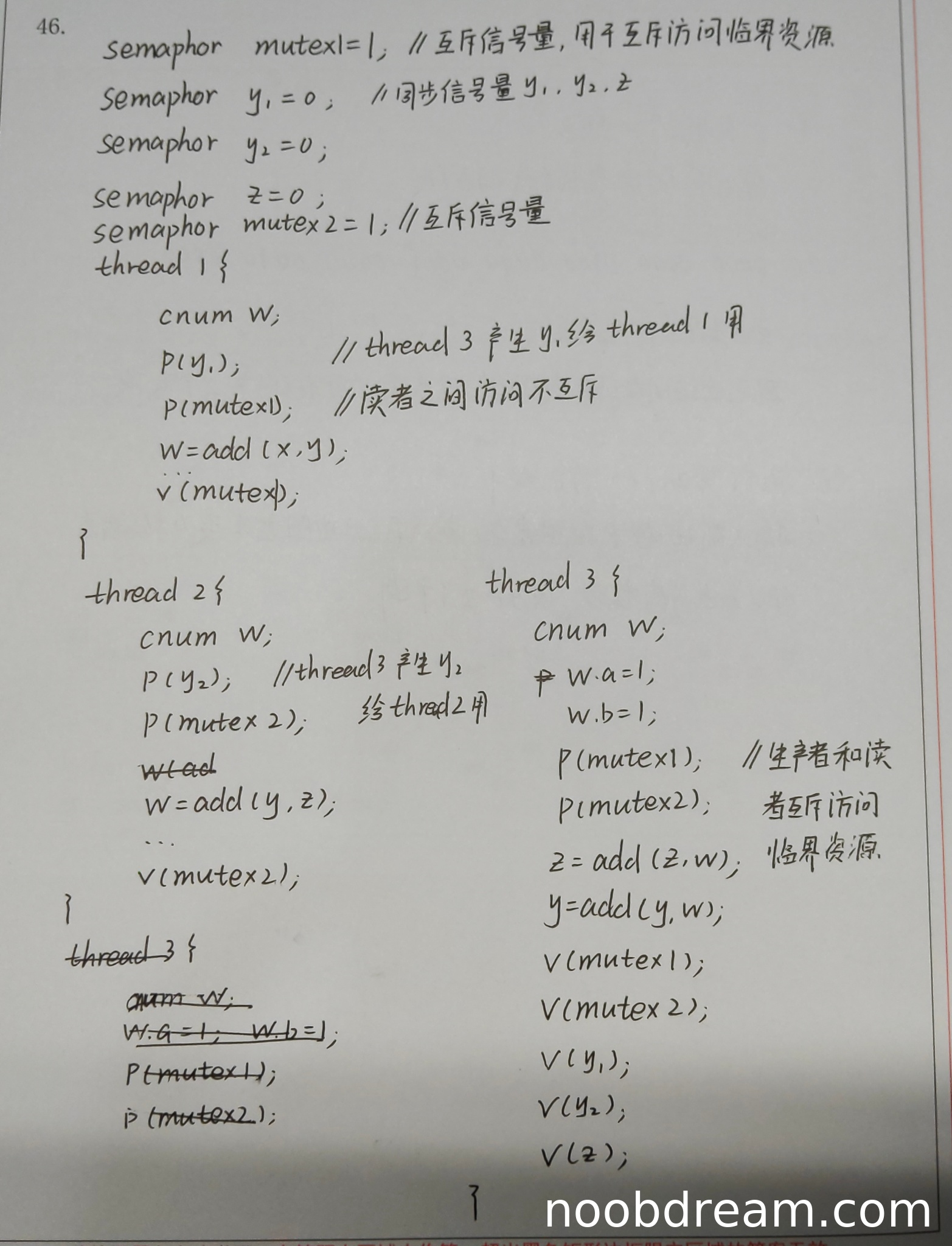 2. 虽然使用了 P(mutex1) 和 V(mutex1) 保护 add(x,y),但因为没有正确理解互斥对象,且前面 P(y1) 导致逻辑错误。