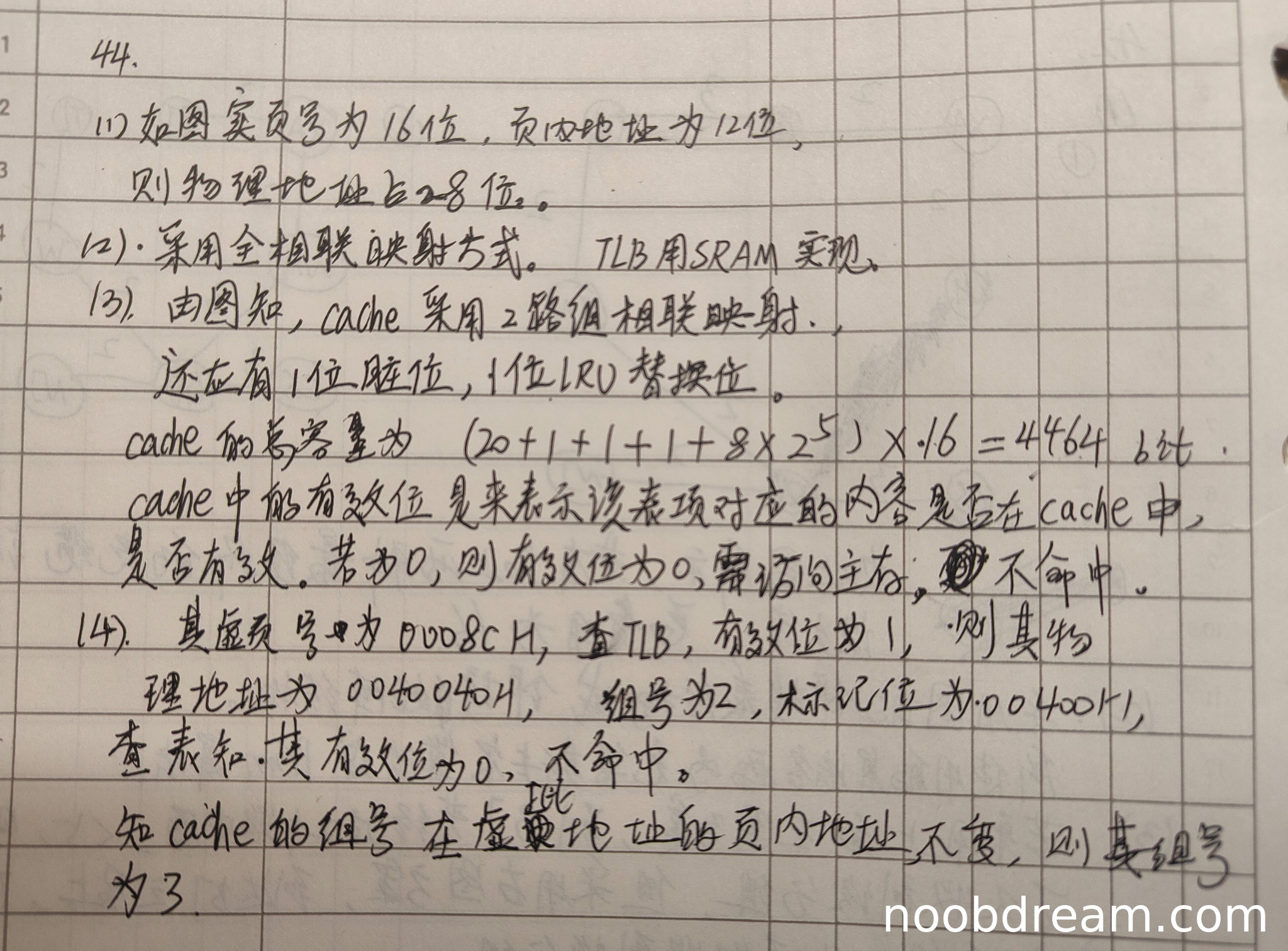 学生正确计算出物理地址为0040040H,并判断Cache不命中(因有效位为0),理由与标准答案一致。但在计算组号时,学生先写“组号为2”,后文又写“则其组号为3”,存在矛盾。根据标准答案,组号应为3。学生最终结论为组号3,但过程中出现不一致,可能为笔误或识别错误。根据禁止扣分原则,若存在识别错误可能则不扣分,且最终答案正确。因此得5分。