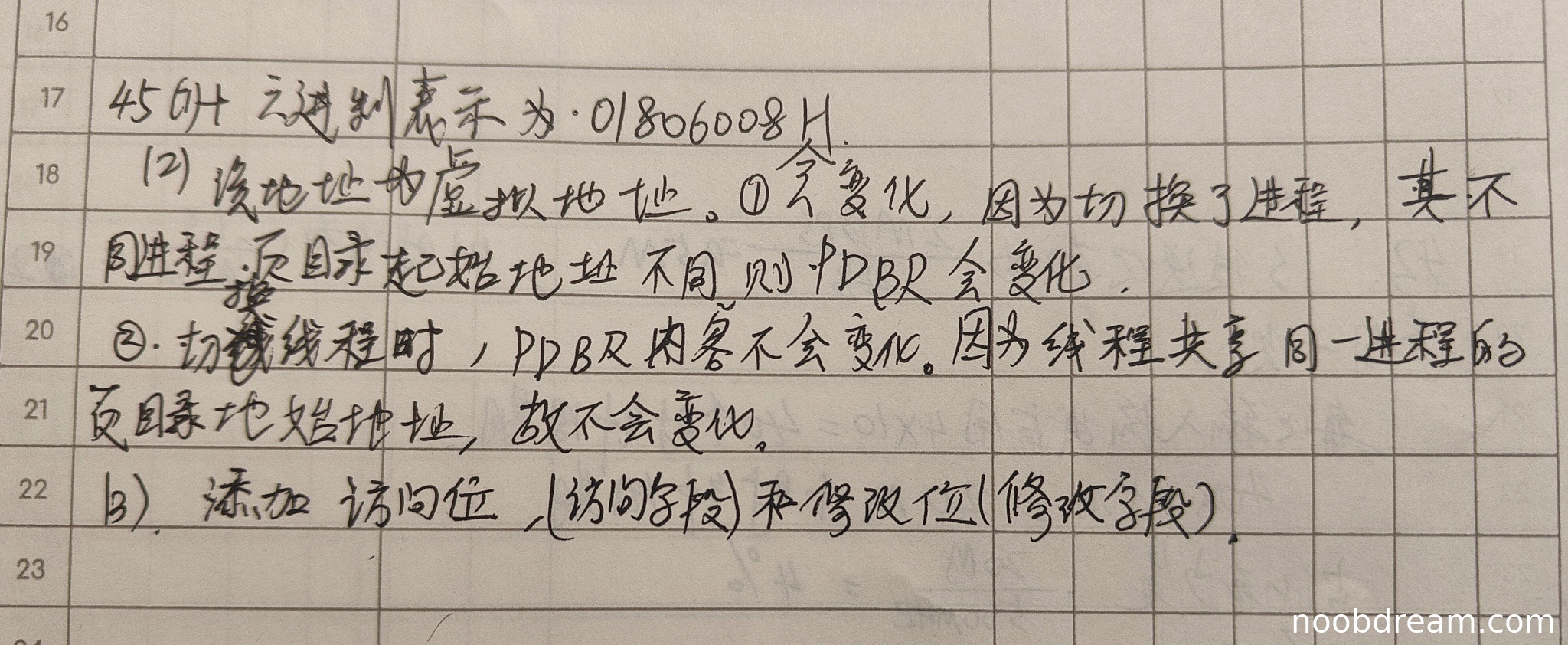 第二问:学生回答“会变化”,理由正确(不同进程页目录起始地址不同),与标准答案一致。得1分。