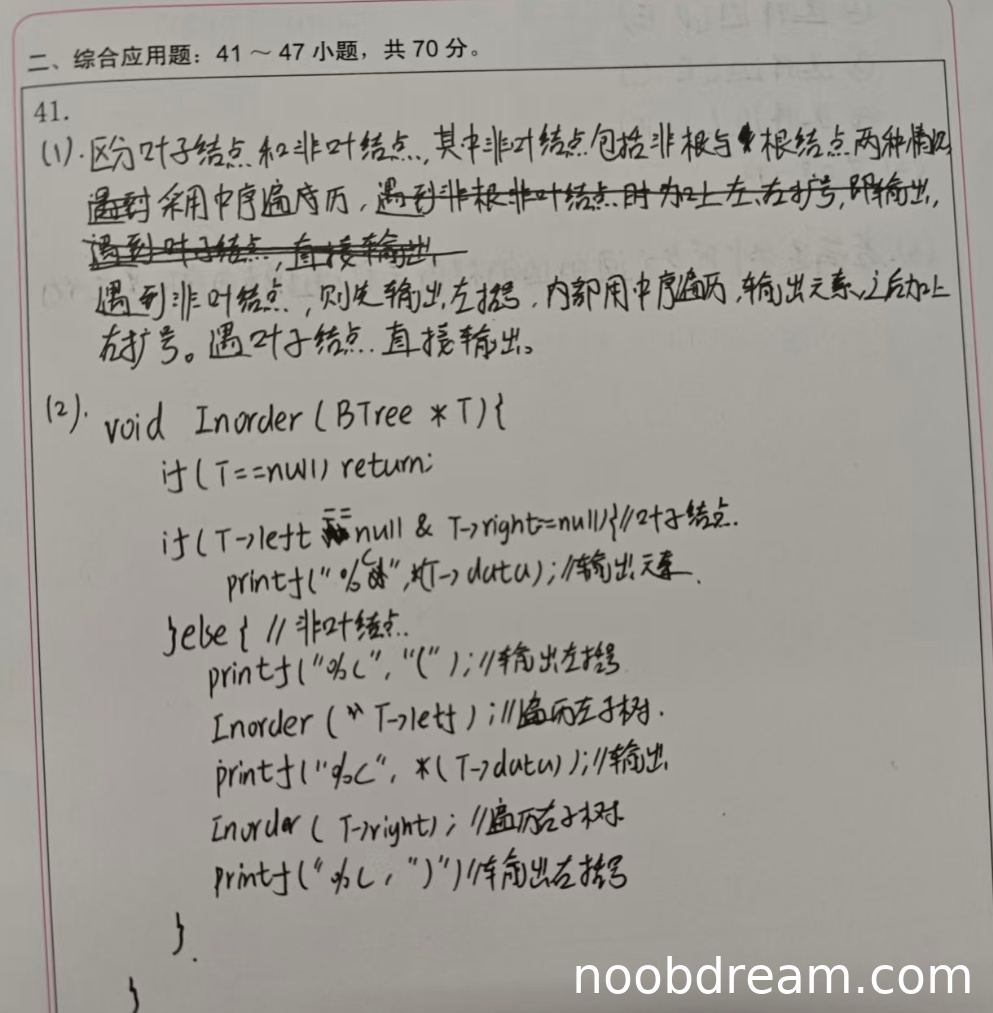 理由:学生的基本设计思想提到了区分叶子结点和非叶结点,采用中序遍历,并在非根非叶结点时加括号。这与标准答案中“基于中序遍历,在适当位置加括号”的核心思想一致。但学生的描述存在不严谨之处:①“非叶结点包括非根与根结点两种情况”表述冗余(所有非叶结点即分支结点,根结点也可能是分支结点);②“遇到非根非叶结点时加上左右括号再输出”未明确如何判断“非根非叶”,实际上标准答案通过深度参数控制,仅对深度大于1的分支结点加括号。由于思路主体正确,但细节描述不够准确,扣2分。