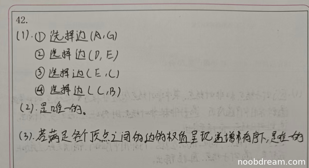学生给出的边依次为:(A,G), (D,E), (E,C), (C,B)。标准答案为:(A,D), (D,E), (C,E), (B,C)。