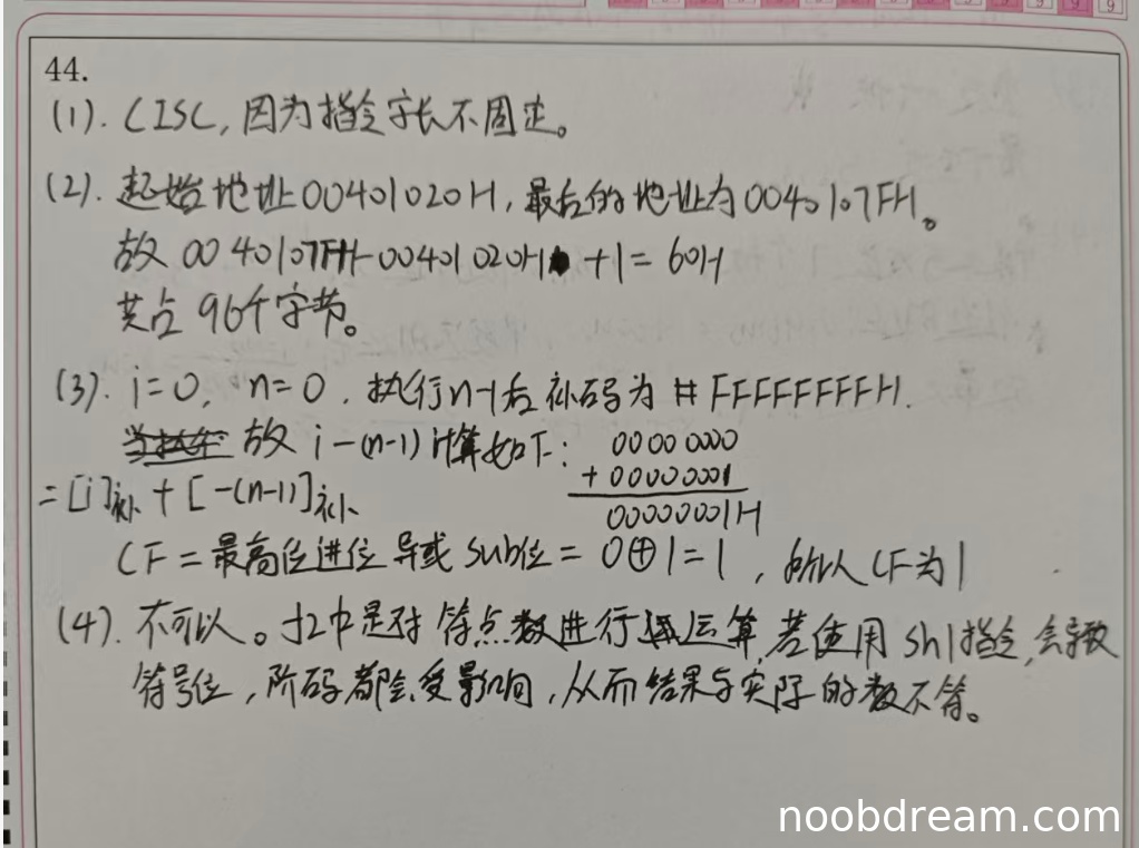 理由:学生正确分析了f1(0)时i=0,n=0,n-1的补码为FFFFFFFFH。计算过程本质上是0减去FFFFFFFFH,即0加上其负数的补码(00000001H),并正确得出CF=1。其表述“最高位进位异或SUB位 = 0⊕1 = 1”虽然与标准答案“进位输出C=0,CF=C⊕1=1”的表述略有差异,但核心逻辑(减法借位标志CF的计算)完全正确。