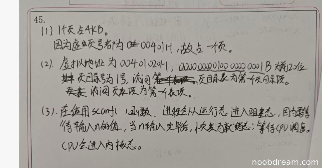 学生正确描述了进程状态变化:从运行态进入阻塞态(等待输入),输入完毕后恢复为就绪态,并指出CPU会进入内核态。标准答案中更详细地提到了“输入结束时,P被中断处理程序唤醒”以及“P被调度程序调度,变为运行态”,而学生答案中“等待CPU调度”隐含了从就绪态到运行态的变化,但未明确“被中断处理程序唤醒”这一中间步骤。根据“逻辑错误扣分”原则,此处描述不够完整,但核心状态转换(运行->阻塞->就绪)和CPU进入内核态的关键点都已答出。考虑到题目分值为4分,且学生答案抓住了主要得分点,可酌情扣1分。因此本题得3分。